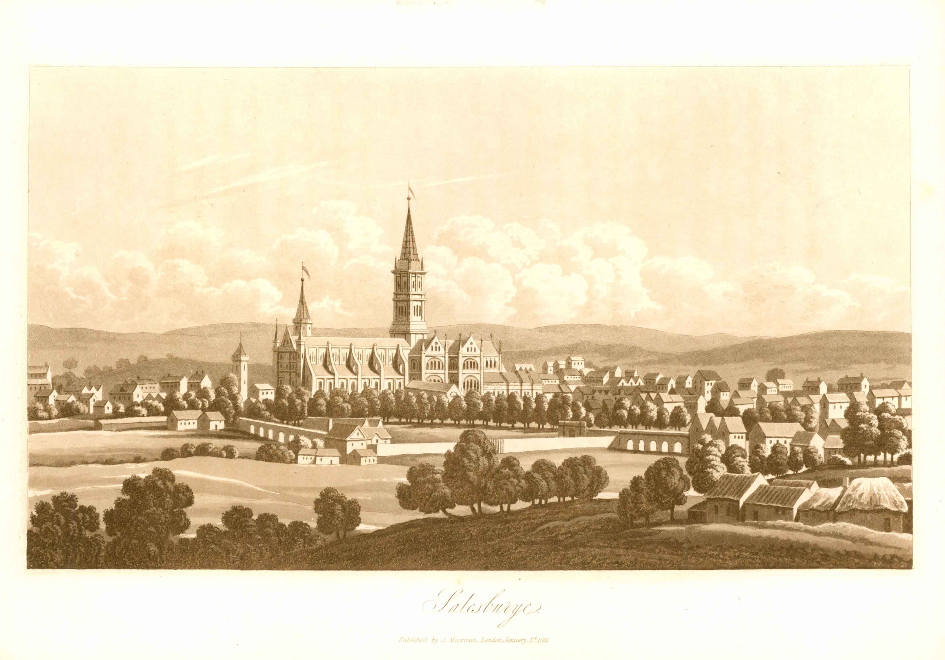 1821 Antique Aquatint print SALESBURYE Salisbury Wiltshire (TOC10)