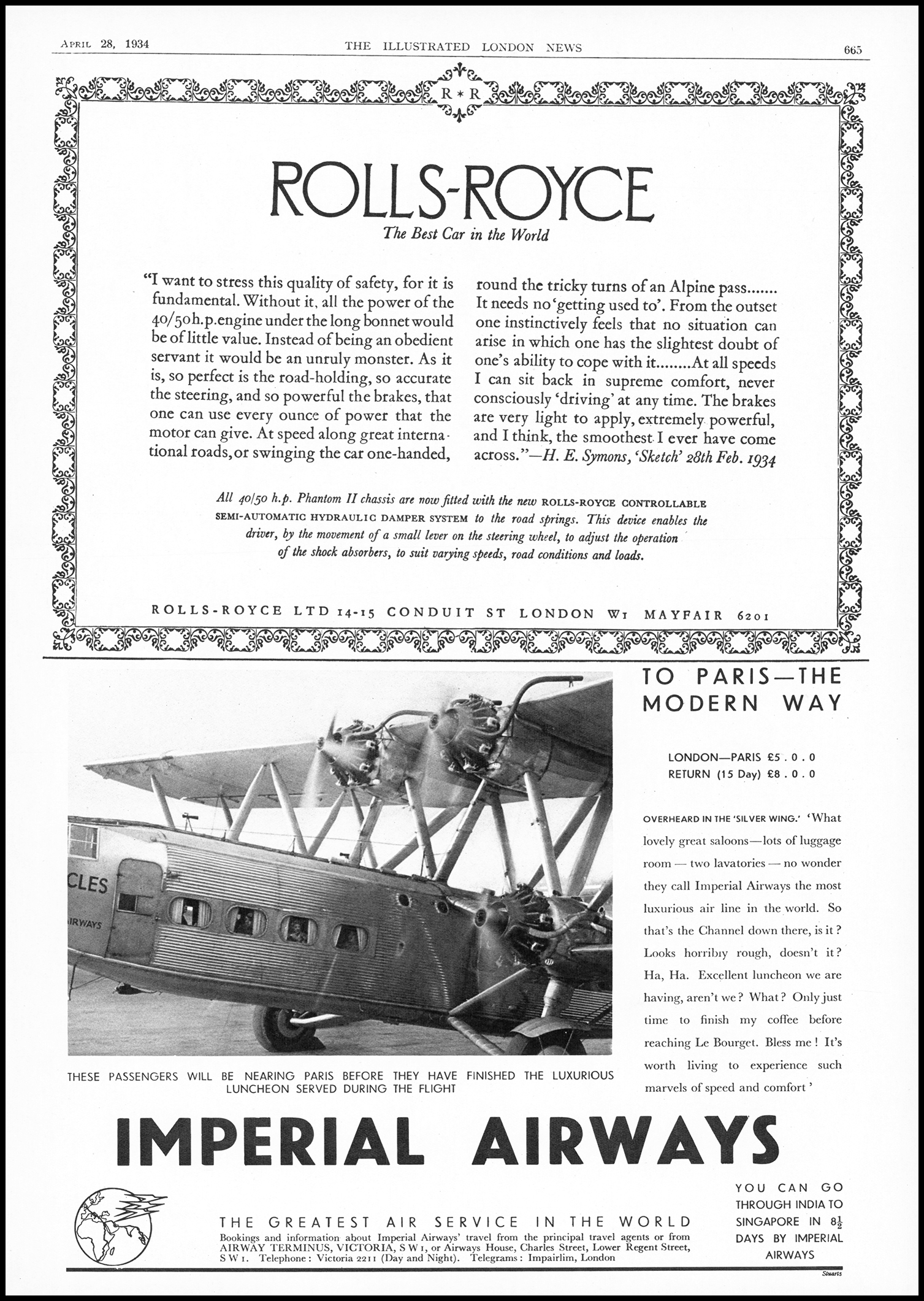 1934 Vintage Advertising ROLLS-ROYCE - IMPERIAL AIRWAYS Paris Silver Wing (AD15-45)