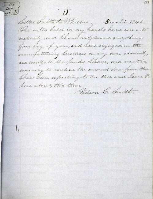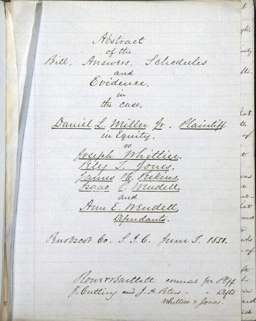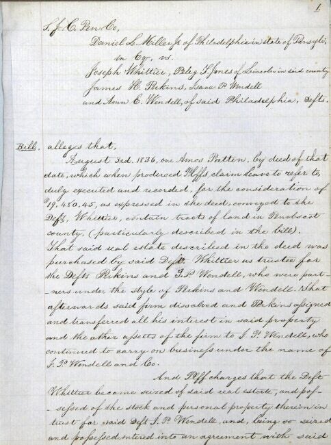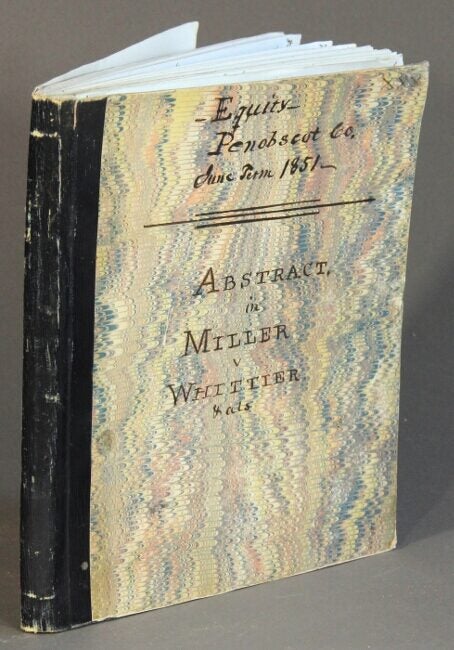 Manuscript notebook, small 4to, pp. 149; neatly written transcript of a legal abstract on blue lined paper, marbled boards backed in calf; title page separated, text clean and legible. Joseph Whittier (1793-1889), the main defendant, was born in Dover, New Hampshire, of Obadiah Whittier, who was an uncle to John Greenleaf Whittier. Joseph's sister Anna was married to Isaac Wendell, another defendant in the case. Isaac Wendell was a wealthy businessman who was cofounder of the Dover Cotton Factory, an early and successful example of the Industrial Revolution in textile manufacture. In 1836 about 600 acres of land, known as the Mattanawcook Purchase (including the town of Lincoln, Maine) were bought as an investment for about $20,000 for Wendell and Perkins, under the name I. P. Wendell and Co. An agreement was made to pay Whittier to manage the property along with a complicated series of arrangements to work the land and a gristmill, hold various mortgages and notes, and eventually turn a profit for the group. The venture was not successful and I. P. Wendell and Co. sold their interest in the land to Daniel L. Miller, who sought to settle obligations of the company and take control of the land more directly. The suit alleges that Whittier refused to acknowledge the receipt of the bills due him and was claiming land as his own property and threatening to sell, and demands that Whittier convey all land and property, and provide accounts of what has been sold and earned. Whittier argued that there was no contractual trust, that he was not compelled to act by the notes due him being in Miller's possession, and that standing to sue on the particulars brought up was not transferred to Miller. The transcription provides the text of the bill, exhibits (letters and contracts), Whittier's answer to the bill, including a record of expenses and receivables, and depositions by co-defendants. P. 68 includes a bracketed note "Pencil marks on original copied in red ink here." The final disposition was not included, but it appears that ultimately the case was found in favor of the plaintiff.