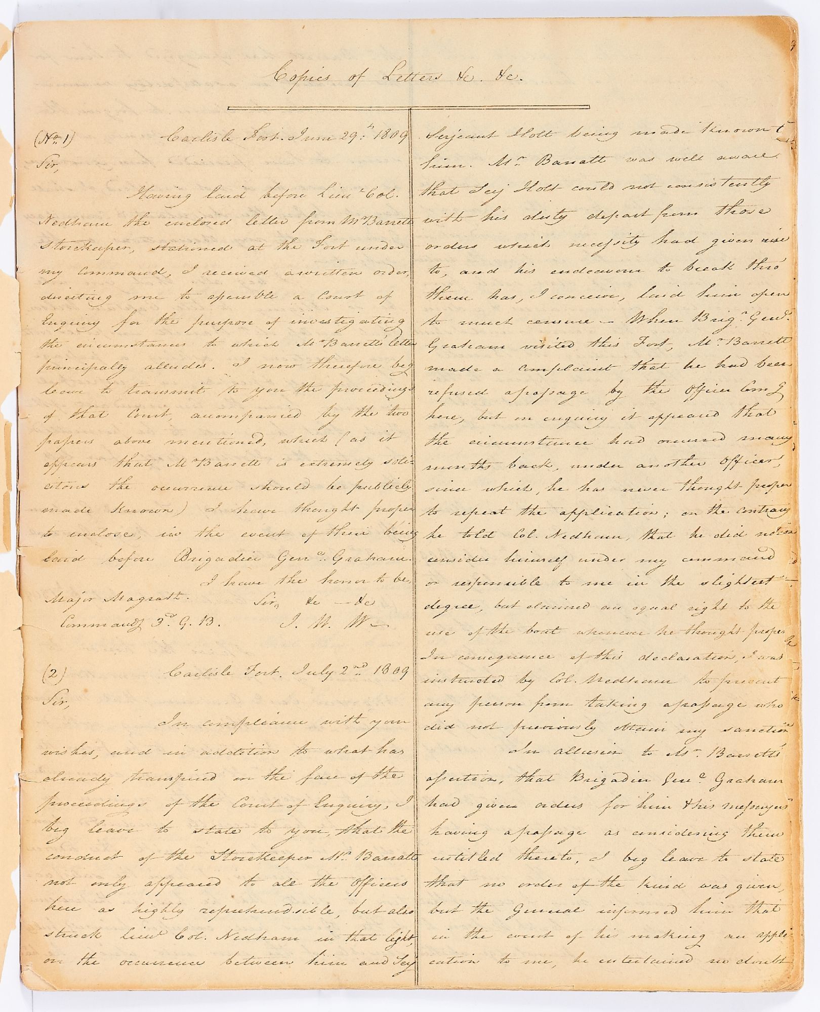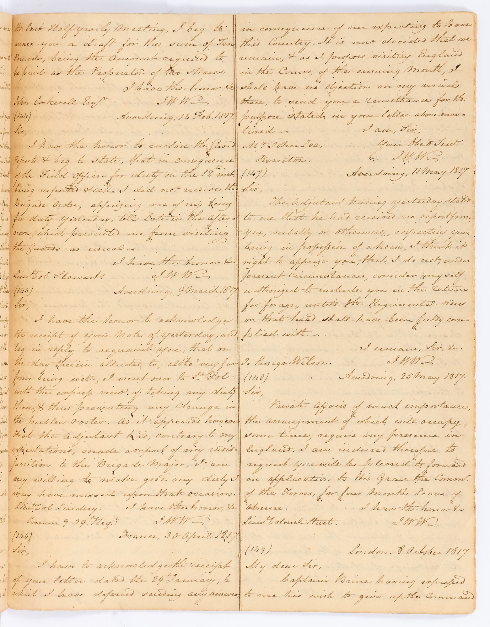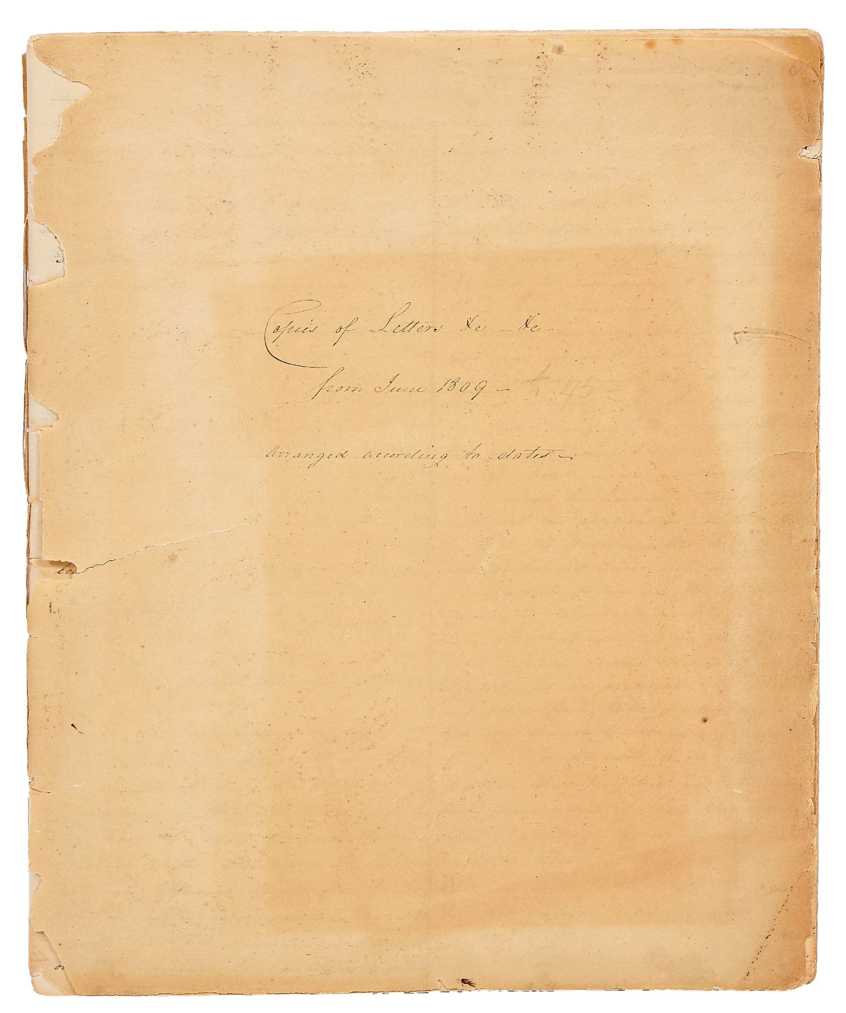 Handwritten letter book consisting of retained copies of letters written by Captain Wilson during four decades of his life, much of it in Ireland and Canada between 1809 and 1845. Measuring 10" x 8". 74pp. Approximately 29,000 handwritten words. Paper covers with string binding. Covers and internal book pages have small chips and age-toning, spine is detached from the cover thus very good. A letter book detailing the life of a Captain Wilson between 1809 and 1845. The book of handwritten copies beginning with his time in command at Carlisle Fort in Ireland. Wilson is often preoccupied with clerical and menial tasks, settling disputes and sending reports, until he is transferred to Bandon in May of 1810. Wilson moves frequently, spending less than six months to a year in each new post. Bantry, Bath, Hereford, Weymouth, Spain, Winchester, Paris, St. Vast, London, and other places before settling in Plymouth in 1820, before moving once again. Wilson writes about the negligence in the camps where he is stationed, often citing disrepair, grime, and alcoholism in the barracks. He also writes about his shares in the Gas Light Company and the Coke Company. Wilson s constant movement is due in part to his need for money. He frequently writes about his financial problems and with each move is hopeful to advance in the ranks and receive commensurate pay. He finally writes in 1818 about his desire to retire from the service and accepts half pay to avoid going back to Ireland with his regiment. Wilson s retirement was prompted by his weariness from his long service as well as the discouraging conditions that he witnessed. He writes about the soldiers turning to alcoholism, family members dying, his inability to help a young woman and her daughter repatriate to Ireland, and the rape of a five-year-old boy. He also devotes a full letter to his dismay when his copy of Lord Byron's poems is found missing from his room. Letters from 1828 and after largely discuss the transfer of his shares in Gas Light Company and the Coke Company into a wine business, with a brief word of worry about the cholera outbreak in France; his son is deaf and dumb and the asylum may close (ominously the son is not mentioned again). Later in 1841 he and his family move to Canada, and aside from some difficulty in receiving money for his commission, he quickly adapts to his new life with the last few letters focused on barrels of flour, orders of pork, and a recently purchased pianoforte. An intriguing and voluminous collection of letters detailing a military officer's daily life, service, and travels, and his struggles to maintain his family. We suspect that further inquiry could very likely uncover more information about Captain Wilson.