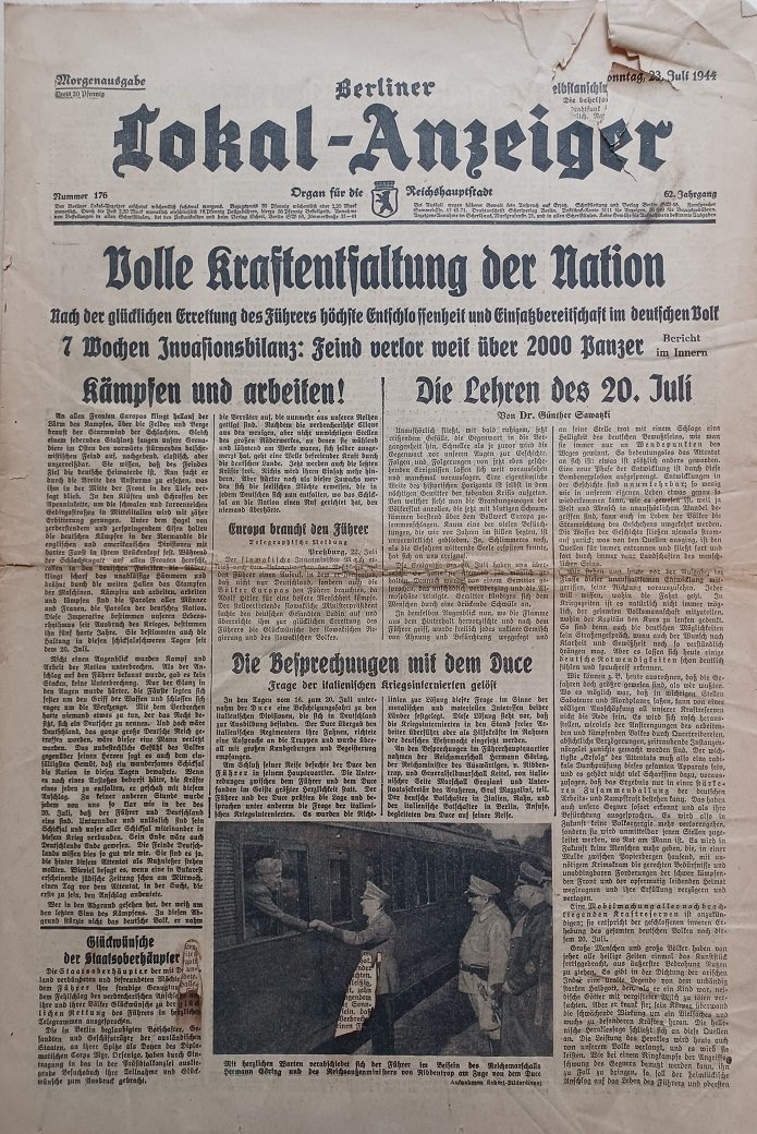 Berliner Lokal-Anzeiger. Nummer 176. Sonntag, 23. Juli 1944. (Morgenausgabe). Volle Kraftentfaltung der Nation. Nach der glücklichen Errettung des Führers höchste Entschlossenheit und Einsatzbereitschaft im deutschen Volk.