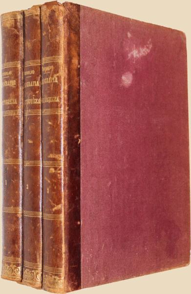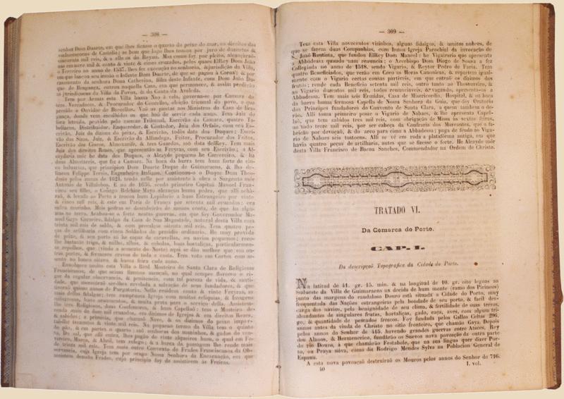 e descripçam topografica do famoso reyno de Portugal, com as notícias das fundações das Cidades, Villas, & Lugares, que contem, Varões ilustres, Genelogias das Familias nobres, fundações de Conventos, Catálogos dos Bispos, antiguidades, maravilhas da natureza, edifícios, & outras curiosas observaçoens. [Tomo I offerecido a Elrey D. Pedro II. / Tomo Segundo offerecido ao sereníssimo Rey Dom Joam V Nosso Senhor. / Tomo Terceyro offerecido à Serenissima Senhora Dona Mariana de Austria, Rainha de Portugal]. Author o P. António Carvalho da Costa, Clerigo do Habito de S. Pedro, Mathematico, natural de Lisboa. Segunda edição. Typographia de Domingos Gonçalves Gouvea. Braga. 1868 e 1869. Obra em 3 volumes. In fólio (de 31x22 cm.) com (xv)-463-xlviii-(i); viii-421-xl-(iii); e (xiv)-461-xvi-(i) pags. Encadernações da época com lombadas em pele Exemplar com título de posse manuscrito sobre as folhas de rosto de cada volume. Inocêncio I, 105 e XX, 189: P. "António Carvalho da Costa, Presbítero secular, natural de Lisboa onde nasceu em 1650, e morreu em 1715. Não devendo muito á natureza pelo que diz respeito aos dotes físicos, pois todos os seus biógrafos no-lo pintam de pequena estatura, corcovado, e disforme, foi contudo ornado de muito talento, e amor ao estudo, adquirindo copioso cabedal de instrução e conhecimentos nas ciências matemáticas que professou, e na história e topografia do reino, do que dão testemunho as suas obras. Frei Manuel de Figueiredo, na sua alias resumida e acanhadíssima Descripção de Portugal, na pag. XVII, falando da Corographia e do Padre Carvalho diz que este «Empreendendo na composição desta obra uma acção merecedora de muito louvor, seria mais estimável o seu projecto, se tivesse talentos e meios para desempenhar a sem mendigar e crer muito do que mandou estampar». Este juízo do cronista cisterciense há sido confirmado por outros críticos, e ninguém hoje duvida de que a Corographia do P. Carvalho envolva gravíssimos defeitos. Notam se lhe principalmente faltas e erros na parte genealógica, em que parece terem sido muito escassos os seus conhecimentos, recebendo por isso sem critério as noticias que os interessados lhe forneciam, abusando da sua sinceridade, ou talvez da condescendência a que o obrigava a mingua de recursos próprios. Os catálogos dos bispos das catedrais do reino passam também por pouco exactos: e no tocante á origem e fundações das cidades e vilas adopta sem crítica nem exame as opiniões de Fr. Bernardo de Brito, e dos outros escritores do mesmo jaez que em seu tempo andavam em voga, e cujos sonhos corriam ainda como verdades indubitáveis. Tais defeitos todavia não obstam a que esta obra seja estimada e procurada dentro e fora do reino, e os exemplares vão escasseando cada vez mais no mercado, de modo que ao fim de alguns anos terão de tornar se verdadeiramente raros. A Corographia teve 2.ª edição. Braga, typ. de Domingos Gonçalves Gouveia, 1868-1869. 8.o. 3 tomos: I, de 16-463-48-1 pag.; II, de 8-421-40-1-1 pag.; III, de 14-461-16-1 pag". Language: Português / Portuguese Location/localizacao: I-105-I-5.
