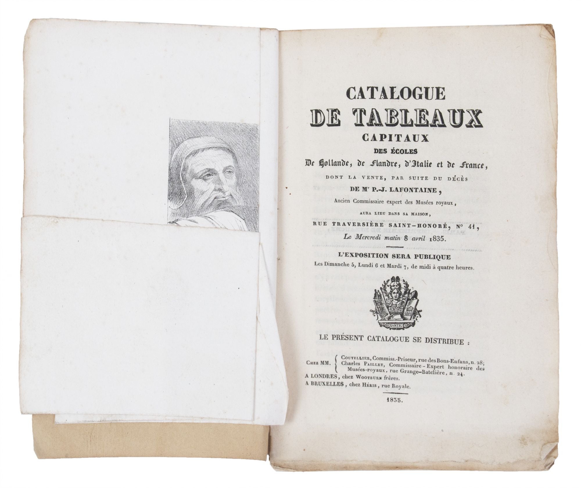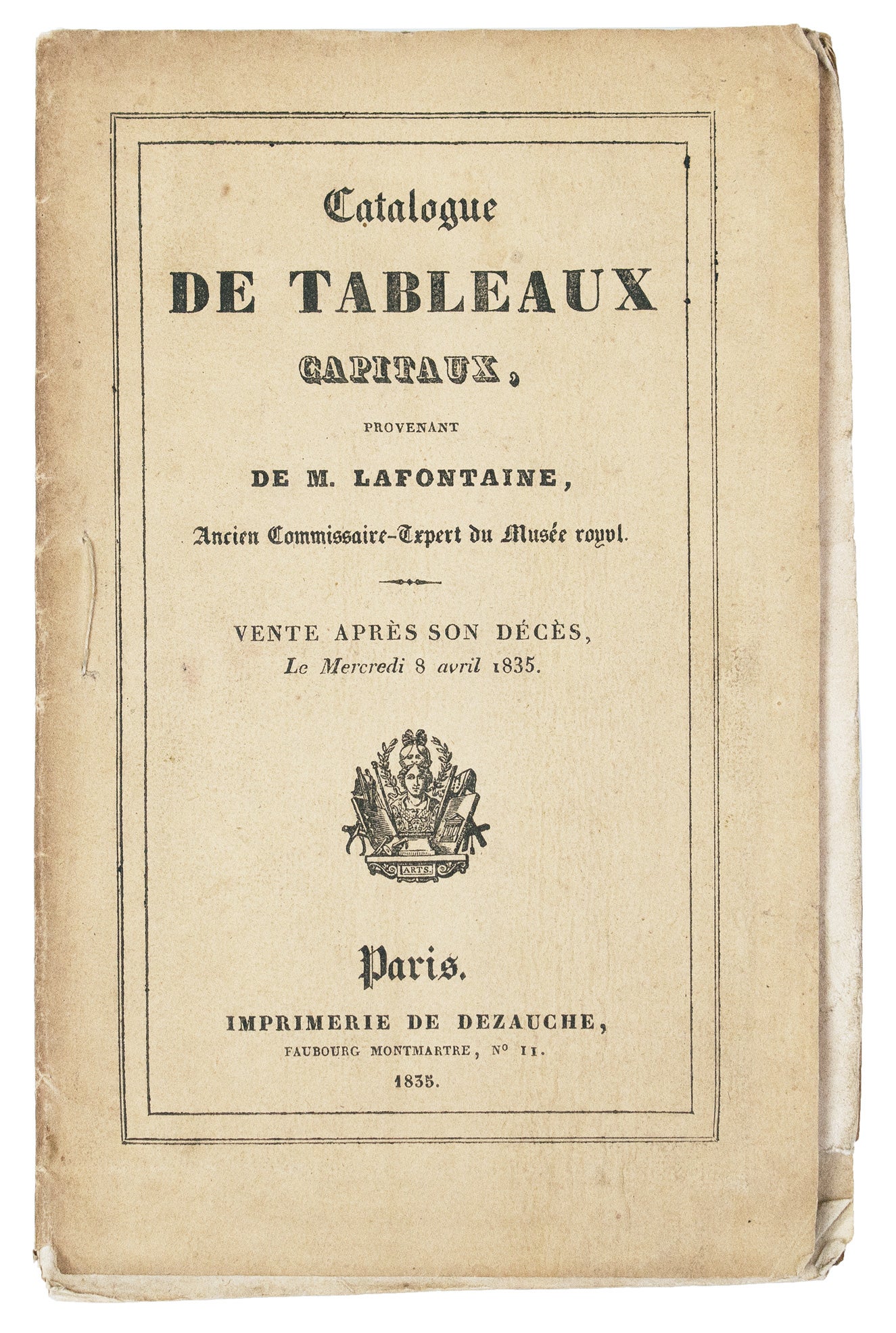 Wood-engraved vignettes on upper & lower wrappers, one large folding lithographed frontis. 8vo (210 x 140 mm.), orig. printed wrappers, stitched as issued. Paris: Coutellier & C. Paillet; London: Wootburn frères [sic.]; Bruxelles: Héris, 1835. A very scarce catalogue, in original state, of the personal art collection of Lafontaine (1758-1835), who "took care to prepare every new stage in his career without ever allowing himself to be affected by the political or economic changes." Blumenfeld, p. 218. Born in Flanders, he trained under the artists Kaplan van Neste and Jean Douelle. After his acceptance into the Académie, Lafontaine exhibited a number of paintings at the Salons of 1789 and 1791, and developed close ties with several painters, including Greuze. It also seems that Parisian experts had engaged him as an agent and scout starting in 1779; he devoted himself entirely to dealing some time in the mid-1790s. Lafontaine took full advantage of fluctuations in taste and supply and successfully arbitraged between England and the Continent throughout his career. Among countless profitable transactions, one of his most famous was an exchange with the Prince of Wales for Rembrandt s The Standard Bearer (now coll. Elie de Rothschild) in return for a group of lesser paintings. The present auction catalogue begins with an informative memorial likely written by the expert of the sale, Charles Paillet (son of the great dealer, A.J. Paillet), who recalls Lafontaine as a helpful and enterprising colleague. It then describes 32 paintings (by da Vinci, del Sarto, Schedoni, Potter, Berghem, van Dyck, Callot, S. Bourdon, Lafontaine himself, etc.). Lot 1, a painting of Herodias receiving the head of John the Baptist (reproduced with the folding frontis.), is attributed to da Vinci; however, this composition, of which there are three known variants one at the National Gallery in London, and another, possibly the original, at the Kunsthistorisches Museum, Vienna is now re-attributed to Cesare da Cesto (1477-1523), one of the so-called Leonardeschi. Paillet provides measurements and lengthy descriptions for most of the paintings. The final six lots consist of drawings, books, and Lafontaine s collection of sale catalogues. A fascinating sale catalogue of a noteworthy dealer s personal collection. In original state and nice condition. ? Lugt 13949. C. Blumenfeld, "Pierre-Joseph Lafontaine and his Exploitation of European Art Market Imbalances in Paris and London, 1795-1815" (pp. 217-30), in S. Avery-Quash & C. Huemer, eds., London and the Emergence of a European Art Market, 1780-1820 (2019), p. 218 "Lafontaine in fact played an important role in the development of the European art market during this period beset by major upheavals. For the years 1795-1815 alone, the Getty Provenance Index records 1,690 transactions under his name in Germany, France, Belgium, Holland, and Great Britain, and demonstrates that he was drawing far superior profits from the market than his Parisian colleagues. Most importantly, he was the only Fleming equally at ease in Paris and London and the only dealer whose business survived the political vicissitudes, enabling him to continue working from the 1780s to the July Monarchy." See this chapter for a wonderful in-depth examination of Lafontaine s evolution from artist to titan of the European art trade.