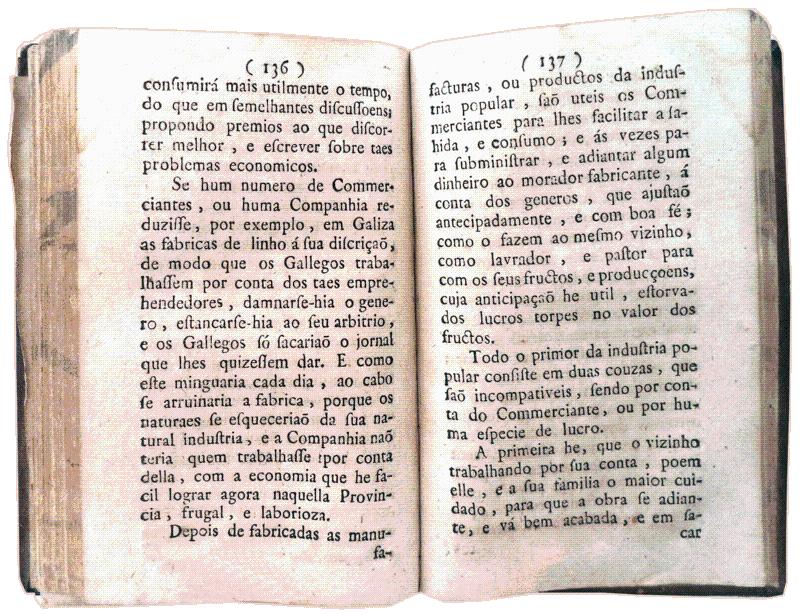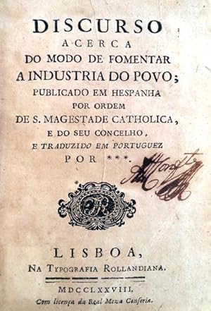 PUBLICADO EM HESPANHA POR ORDEM DE S. MAGESTADE CATHOLICA, E DO SEU CONCELHO. E TRADUZIDO EM PORTUGUEZ POR ***. Lisboa, Na Typografia Rollandiana. MDCCLXXVIII. [1776]. Com licença da Real Meza Censoria. De 14,9x10,5 cm. Com [xviii], 222, [viii] págs. Encadernação da época inteira de pele, com nervos, rótulo vermelho, título e ferros a ouro gravados na lombada com decorações vegetalistas nas casas. Folhas preliminares iniciais incluem: Prologo do editor e Advertencia do author. As folhas inumeradas finais contêm: Catalogo dos livros impressos á custa de Francisco Rolland, Impressor-Livreiro em Lisboa, na esquina da Rua do Norte. Exemplar com assinatura ilegível de posse no rosto e marcas de posse de José Joaquim Lampreia, consistindo numa etiqueta impressa colada no alto da página 1 e assinatura na página 216. A tradução é, segundo Inocêncio, da autoria do Capitão Manuel de Sousa (Lisboa 1737-1785?) um literato e poeta que traduziu numerosas obras do francês e castelhano. A publicação desta tradução marca o início da colaboração de Sousa com a Tipografia Rollandiana, que veio a editar vários trabalhos deste escritor, muitas deles póstumos. Obra, relativa à realidade social e económica de Espanha, imbuída de conceitos do Iluminismo, como a crença no progresso e no desenvolvimento continuado por indústria dos homens, propugnando grande número de medidas, como por exemplo: o desenvolvimento da agricultura e da indústria, a arregimentação de todas as pessoas em actividades imediatamente produtivas, a diminuição radical dos feriados religiosos (o autor aponta como exemplo negativo a Diocese de Toledo que, além dos domingos, tinha 43 feriados religiosos) e a exploração do trabalho dos presos. Estas ideias potenciadas pela Revolução Industrial, levaram aos abusos sobre os trabalhadores que caracterizaram os Séculos XIX e XX e que provocaram reacções violentas como o movimento Comunista. Interessante fonte para estudar e conhecer o ambiente mental da segunda metade do Século XVIII. Inocêncio VI, 112-113. MANUEL DE SOUSA, Capitão de infantaria, com exercicio de Engenheiro, Socio da Arcadia Ulyssiponense [.] 1330) Discurso ácerca do modo de fomentar a industria do povo: traduzido do hespanhol. Lisboa, 1778. 8.º. Sem o nome do traductor. Language: Português / Portuguese Location/localizacao: M-5-D-36.