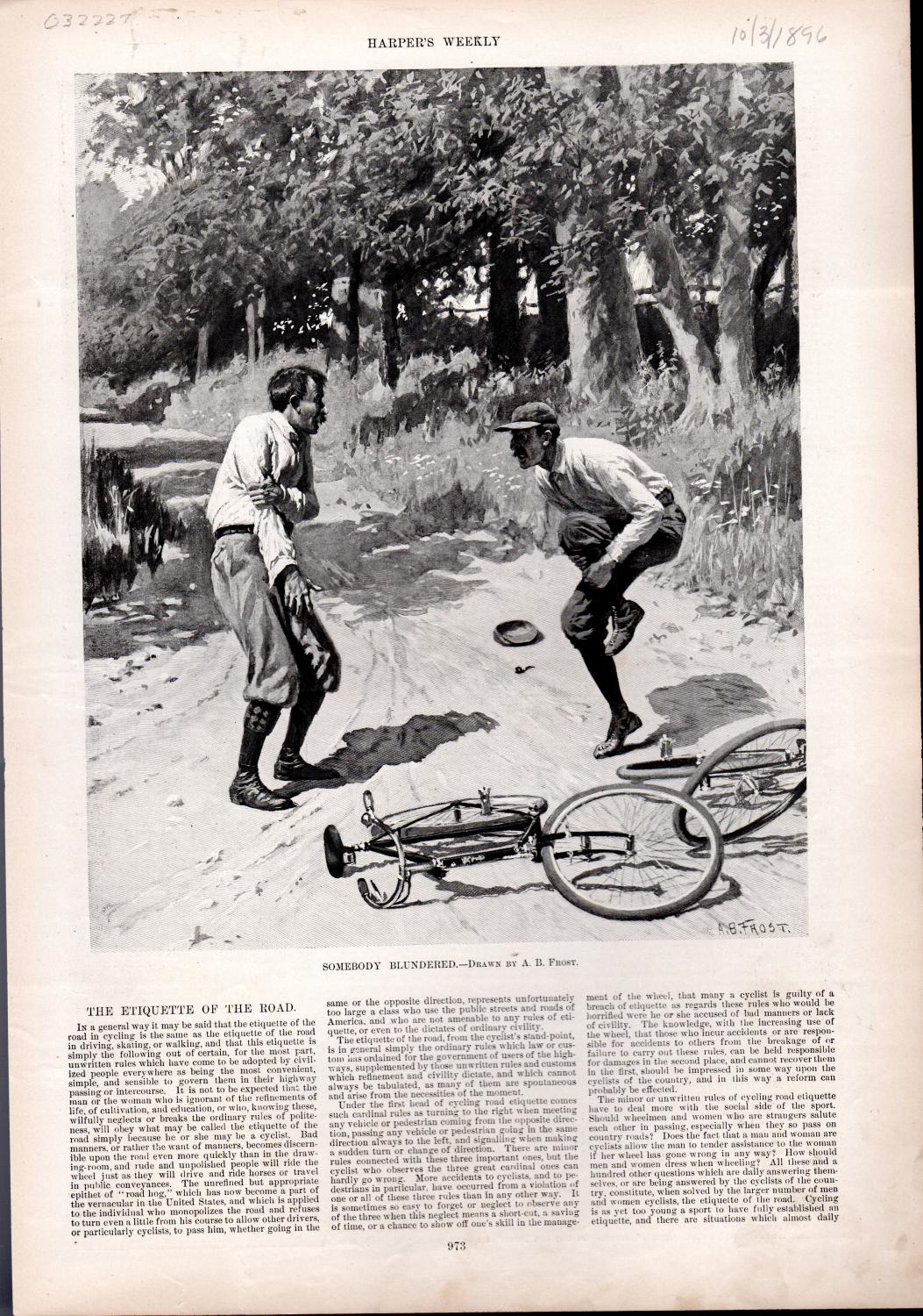ENGRAVING: "Someboy Blundered: Etiquette of the Road" (Bicycles). .engraving from Harper's Weekly, October 3, 1896