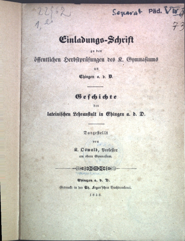 Einladungs-Schrift zu den öffentlichen Herbstprüfungen des K. Gymnasiums zu Ehingen a. d. D.: Geschichte der latienischen Lehranstalt in Ehingen a. d. D.;
