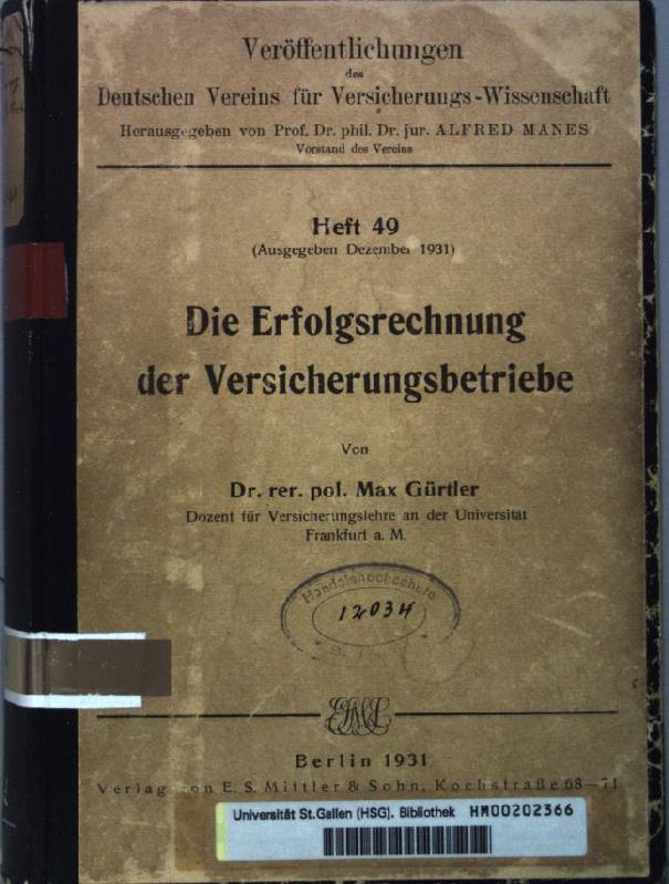 Die Erfolgsrechnung der Versicherungsbetriebe. Veröffentlichungen des Deutschen Vereins für Versicherungs-Wissenschaft. Heft 49.