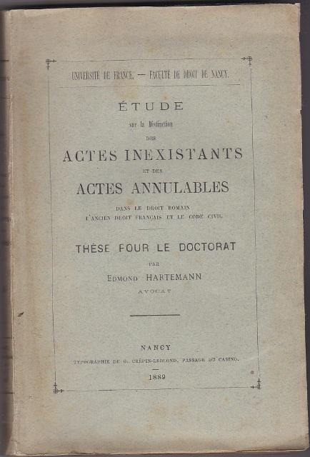 Etude Sur La Distinction Des Actes Inexistants Des Actes Annulables Dans Le Droit Romain , L'ancien Droit Français et Le Code Civil