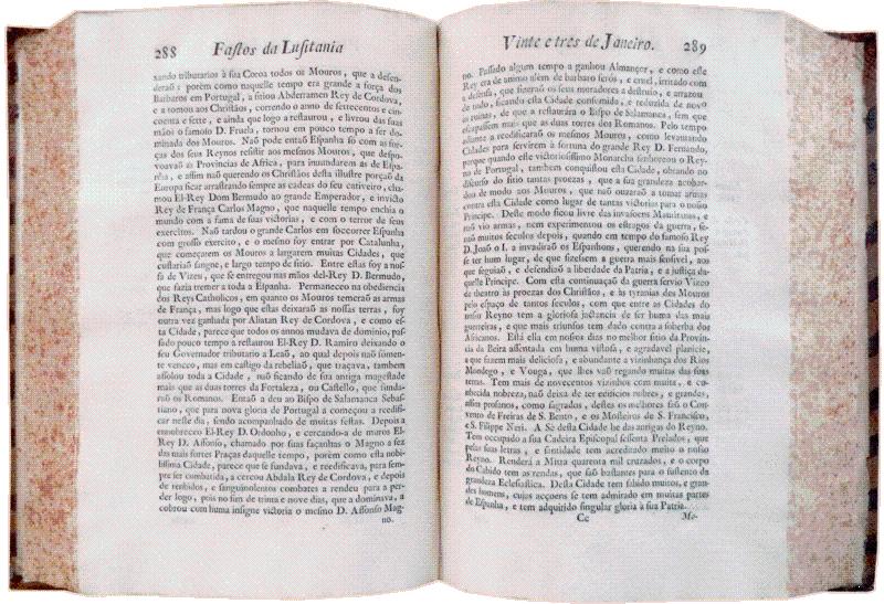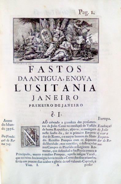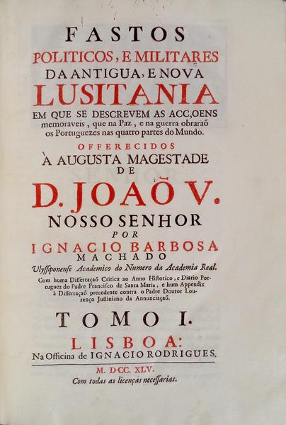 EM QUE SE DESCREVEM AS ACÇOENS memoráveis, que na Paz, e guerra obraraõ os Portuguezes nas quatro partes do Mundo. Por IGNACIO BARBOSA MACHADO Ulyssiponense Academico do Numero da Academia Real. Com huma Dissertaçaõ Critica ao Anno Historico, e Diario Portuguez do Padre Francisco de Santa Maria, e hum Appendix à Dissertaçaõ precedente contra o Padre Doutor Lourenço Justiniano da Annunciaçaõ. Tomo I. [único publicado] LISBOA: Na Officina de IGNACIO RODRIGUES. M. D.CC.XLV. [1745]. In fólio de 32x21,5 cm. Com [lxxxviii], 711, [iii] págs. Encadernação da época, inteira de pele, com rótulo vermelho, nervos e ferros a ouro na lombada, representando castelos circundados por motivos vegetalistas. Obra impressa em papel de linho muito alvo e de grande qualidade. Impressão em caracteres rotundos muito esmaltados. Folha de rosto impressa a duas cores, adornada com capitulares e ilustrada com duas magníficas vinhetas, tendo ao centro as armas da Casa Real de Portugal, ambas abertas por Debrie. Magnífico exemplar em excelente estado de conservação, com grandes margens e grande sonoridade do papel. Apresenta ex-libris de "Lino A. Affonso" e cota de arrumação de biblioteca da época, a tinta, na guarda interior. Contém anotações marginais a tinta da época. Obra histórica em que o autor descreve cronologicamente os feitos e factos memoráveis da Antiga e Nova Lusitânia. Ainda que inacabada, a obra distingue-se pela sua curiosidade, composta de memórias históricas referentes à Antiguidade Clássica e séculos posteriores, com preciosas indicações relativas ao século XVIII, constituindo, por isso, um valioso dicionário histórico. O projecto de publicação da obra organizava cronologicamente os factos históricos por dias do ano. Assim, este primeiro e único volume publicado, abrange o período entre 1 de Janeiro e 28 de Fevereiro. Refs.: Inocêncio 203. ?IGNACIO BARBOSA MACHADO, irmão mais novo de D. José Barbosa e de Diogo Barbosa Machado, todos tres auctores de elocução purissima, e que pódem servir de mestres da lingua portugueza, na phrase do erudito D. Thomás Caetano de Bem. Foi Doutor em Direito Civil pela Universidade de Coimbra, e tendo exercido alguns cargos de magistratura em Portugal e na America, abraçou depois de viuvo o estado ecclesiastico, tomando ordens de presbytero. Foi Desembargador da Relação do Porto, Ministro do Tribunal da Legacia, Chronista geral do Ultramar, e Academico da Academia Real de Historia, etc. N. em Lisboa a 23 de Novembro de 1686, e m. na mesma cidade a 28 de Março de 1766, e não em 1753 como tem erradamente José Carlos Pinto de Sousa na Bibliotheca Historica, n.º 42. Vej. a seu respeito os Estudos biographicos de Canaes, pag. 250. Na Bibl. Nacional existe um retrato seu de meio corpo. Eram distribuidos por mezes, á similhança do Anno historico, excluindo porém tudo o que especialmente dizia respeito ás cousas ecclesiasticas, em harmonia com o titulo adoptado. O primeiro volume comprehende os mezes de Janeiro e Fevereiro. Do segundo não consta se imprimissem mais que 280 pag., que chegam somente até 19 de Março, e estas apparecem poucas vezes, de modo que os exemplares do tomo I andam quasi sempre desacompanhados. A publicação d'esta obra occasionou uma acalorada polemica entre o auctor d'ella, e o continuador e edítor do Anno Historico o P. Lourenço Justiniano da Annunciação; terminando a final com a obra de Machado, que tem por titulo:? Language: Português / Portuguese Location/localizacao: M-8-B-4.