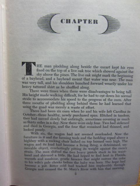 Add to basketPlease see any and all photos connected with this listing. No Dustjacket. A bit scuffed but all pages intact and legible. Good reading copy. Clean. No store stamps. --- HERE'S THE FIRST FEW SENTENCES --- --- The man plodding along beside the oxcart kept his eyes fixed on the top of a live oak tree which showed against the sky above the pines. The live oak might mark the beginning of a bayhead and a bayhead meant that water was near. The man was very tall and his shoulders hunched forward wearily under his heavy tattered shirt as he shuffled along. . .See photos for additional content. . .