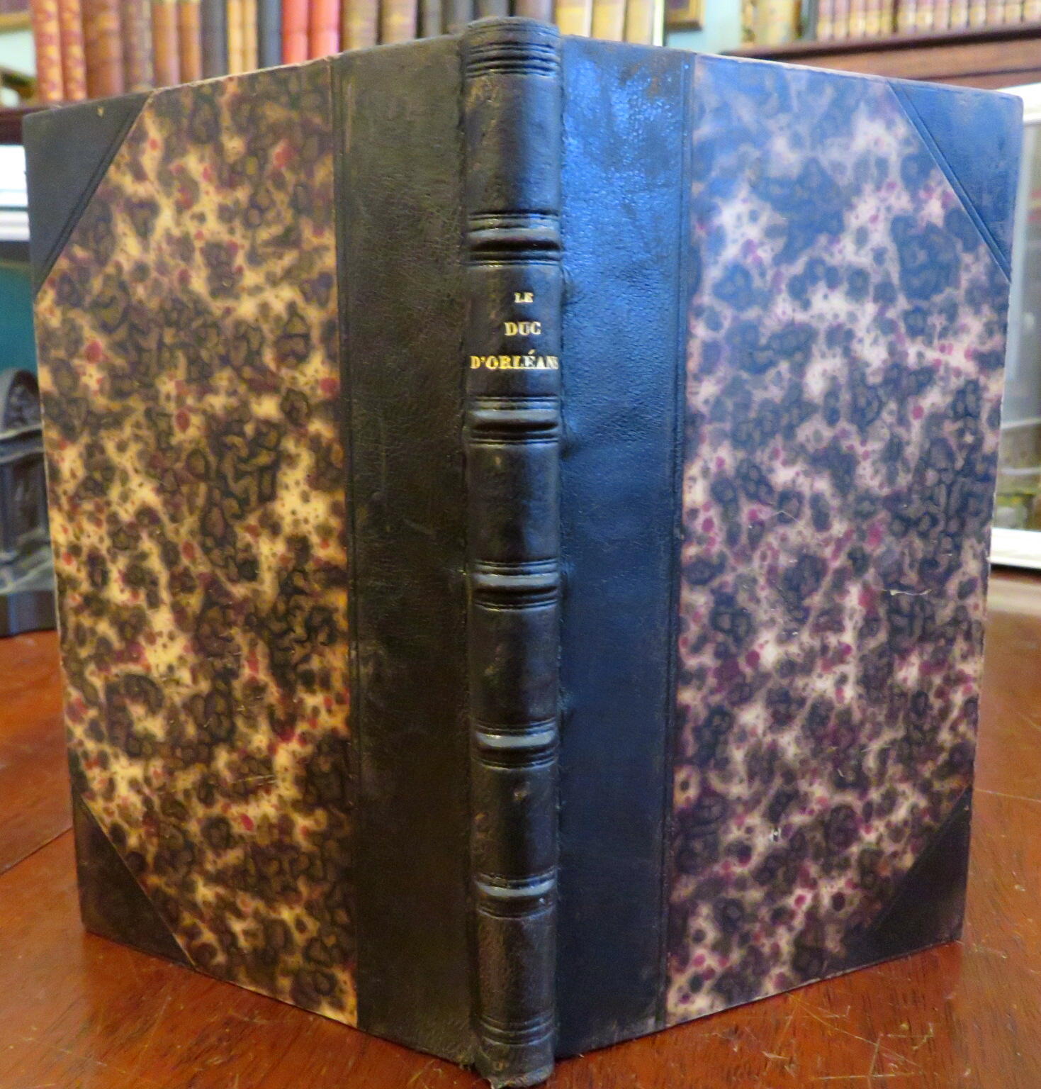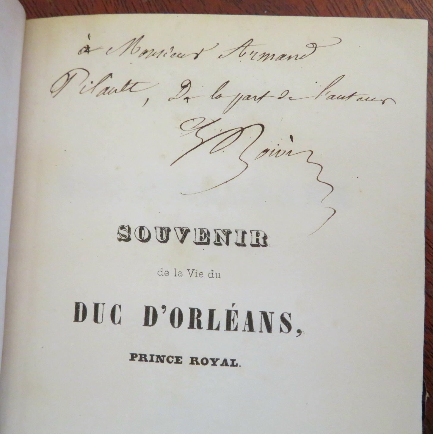 (Old Books, 19th Century Books, Leather Books, French History, Ferdinand Philippe, Duke of Orleans). Souvenir de la Vie du Duc D'Orleans, Prince Royal, by Louis Boivin. Published 1842, Paris by Bretau & Pichery.186 pages. Text in French. Inscribed by the author on fly leaf. Period 1/2 French leather binding, raised bands, gilt title lettering, marbled covers & end papers. Book is almost 180 years old and shows some signs of handling and time. Book is not new or in "new" condition. Binding gently age worn, leather rubbed but still supple, joints slightly scuffed, remains overall attractive as an object. Text block paper is gently toned, light to moderate scattered age spotting, internally still well preserved, tight, sound. Still attractive on the shelf. Book displays a pleasing and unique age patina and is in nice antiquarian condition, any age flaws easy to overlook or forgive. Please review photos for more detail and our best attempt to convey how this antique book survives. Book Measures c. 7 1/4" H x 4 1/2" W.[B3584]. Seller Inventory # B3584