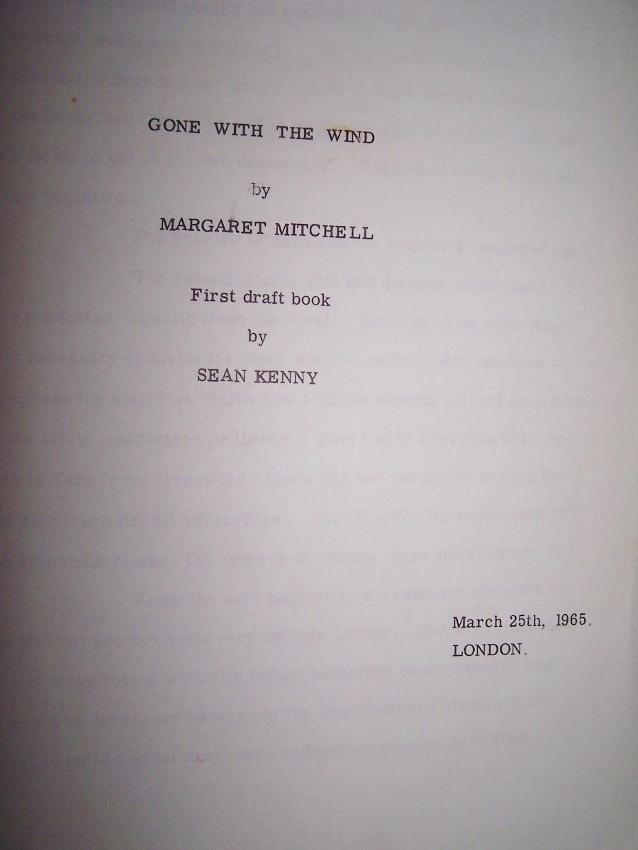 127 pages; Playscript for a theatrical production of GWTW as a stage musical. Complete with two folding plates of stage designs, etc. from the brilliant Sean Kenny. One page has shallow creasing at lower edge, otherwise quite nice in original orange card wrappers held at spine by two brass brads. Sean Kenny (1932-1973) was born in Portroe, County Tipperary, Ireland. He trained as an architect at the Dublin School of Architecture, then went to study at the Frank Lloyd Wright Foundation in Arizona. In 1957, he came to London to work in theatre and turned to stage design. His first work for theatre was the set design for Sean O'Casey's play The Shadow of a Gunman, at the Lyric Theatre, Hammersmith, London in January 1957. He created sets for the world premiere of The Hostage at Theatre Royal in 1960; several plays at the Royal Court; The Royal Shakespeare Company s productions of The Devils and Romeo and Juliet; the National Theatre's Uncle Vanya with Laurence Olivier and Michael Redgrave (1963); and numerous West End productions including Oliver (1960), which won him New York s Tony Award as Best Designer of the Year. He also designed for the opera, The Flying Dutchman (1966), at the Royal Opera House, Covent Garden. Between 1960 and 1970, he designed sets for 32 major West End productions. In 1972, he designed the arena production of Clown Around, directed by Gene Kelly, which was shown in the USA. From the estate of Roger Stevens. Roger Lacey Stevens (1910 1998) was an American theatrical producer, arts administrator, and real estate executive. He was the founding Chairman of both the Kennedy Center for the Performing Arts (1961) and the National Endowment for the Arts (1965). In politics, he made a mark as chairman of the Democratic Party's finance committee in 1956. He produced more than 100 plays and musicals over his career, including West Side Story, Bus Stop, and Cat on a Hot Tin Roof. In 1971, he received Special Tony Award for his body of work. He became known for introducing plays by such adventurous writers as Harold Pinter, Arthur Kopit and Tom Stoppard. Stevens was the General Administrator of the Actors Studio as well as one of the producers of the Playwrights Company, a member of the board of the American National Theatre and Academy (ANTA), and one of the members of a Broadway producing company he founded in 1953 with Robert Whitehead and Robert Dowling. In 1961, he was asked by President John F. Kennedy to help establish a National Cultural Center, and became Chairman of Board of Trustees of what was eventually named the Kennedy Center from 1961 to 1988. In 1965, he received an appointment from President Lyndon Johnson as first Chairman of the National Council on the Arts later named the National Endowment for the Arts. In 1986, Stevens was inducted into the American Theater Hall of Fame. On January 13, 1988, Stevens was presented with the Presidential Medal of Freedom by President Ronald Reagan. In 1988, he was also awarded the National Medal of Arts.