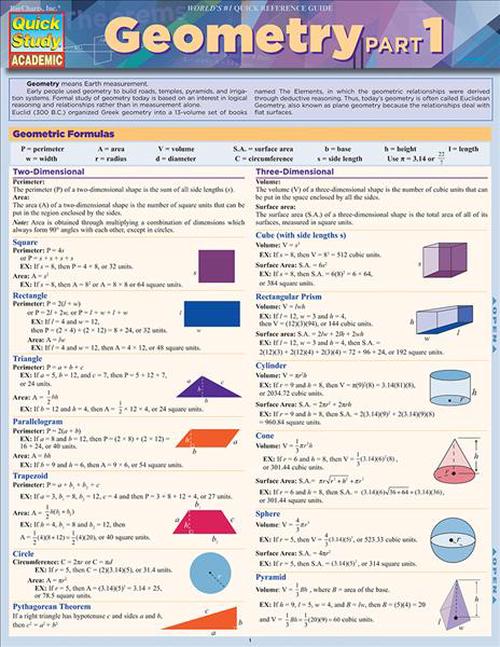 Guaranteed to boost test scores and grades. The essentials of this branch of mathematics are an important foundation that future more advanced math is built upon. Using this as a review and reinforcement tool is quick and easy to do daily or weekly, keeping all concepts fresh once you move deeper into the subject. For complete coverage, get the Geometry Part 2 QuickStudy guide and use the two guides to study, reference, review and ace the grade.