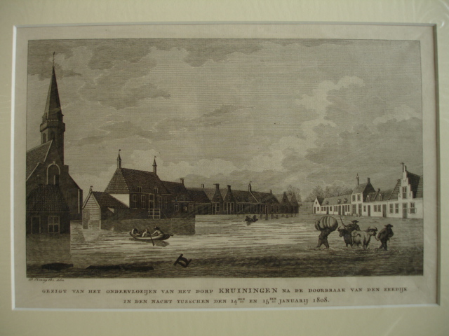 Gezigt van het ondervloeijen van het dorp Kruiningen na de doorbraak van den zeedijk in den nacht tusschen den 14den en 15den januarij 1808.