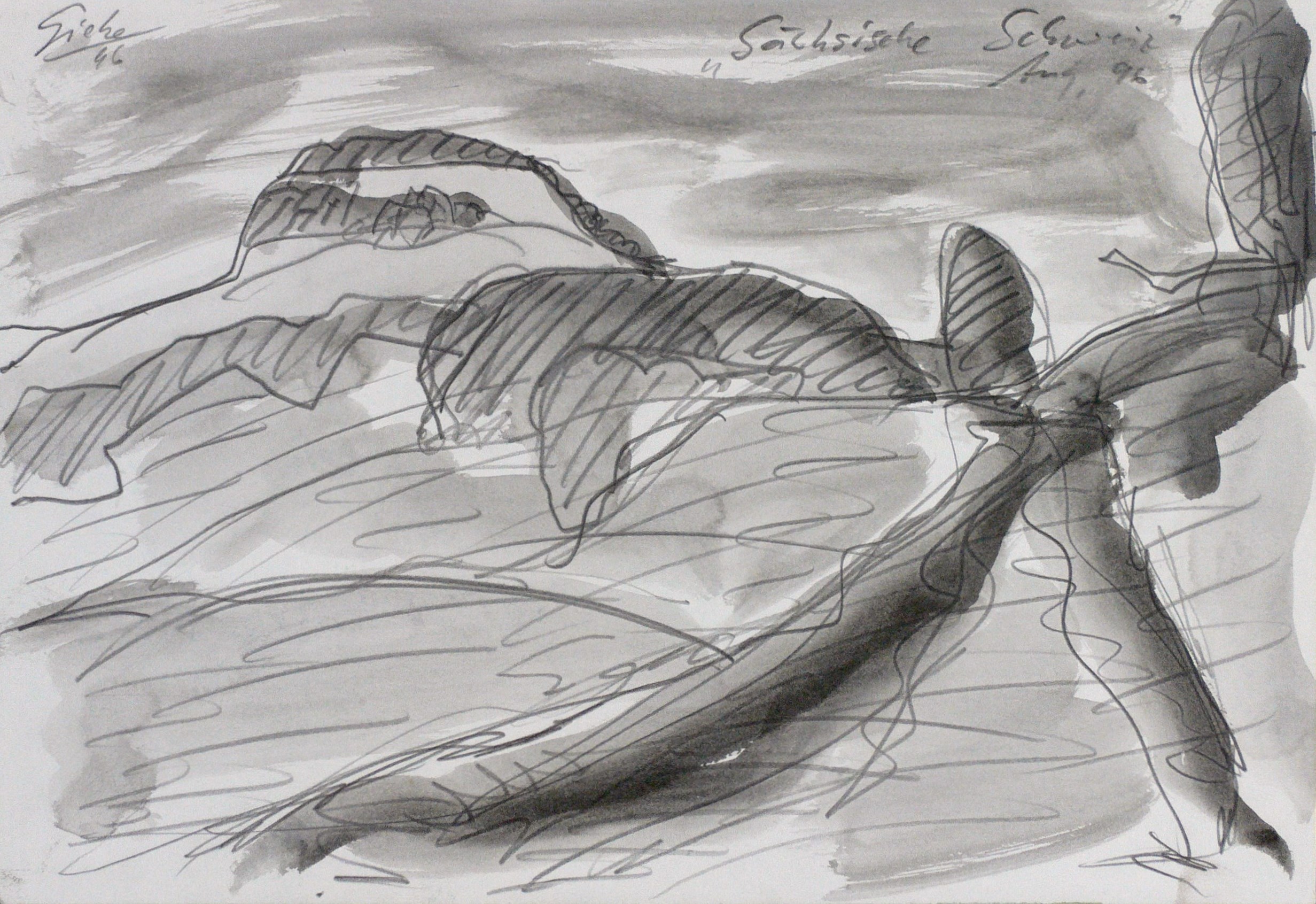 Add to basketGiebe, Hubertus. Sächsische Schweiz.1996. Zeichnung / Bleistiftzeichnung, in Tusche hellgrau laviert, auf Papier. Originale Künstlergrafik, von Hubertus Giebe. Unikat. 20,6 x 29,7 cm (Darstellung / Blatt).Sehr guter Zustand.Hubertus Giebe (*1953 Dohna / Sachsen, lebt und arbeitet in Dresden). Deutscher Maler und Grafiker, bedeutender Vertreter des Expressiven Realismus. 1969-72 Abendstudium der Malerei und Grafik an der Hochschule für Bildende Künste. 1974-76 Studium der Malerei und Grafik an der HfBK Dresden. 1976 Exmatrikulation auf eigenen Wunsch. 1978 externes Diplom an der Hochschule für Grafik und Buchkunst Leipzig. Meisterschüler von Bernhard Heisig. 1982-86 Leitung des Grundlagenstudiums für Malerei und Grafik an der HfBK Dresden. 1987 Berufung zum Dozenten für Malerei und Grafik an der HfBK Dresden. 2004 Vertretungsprofessur für Malerei an der Universität Dortmund.