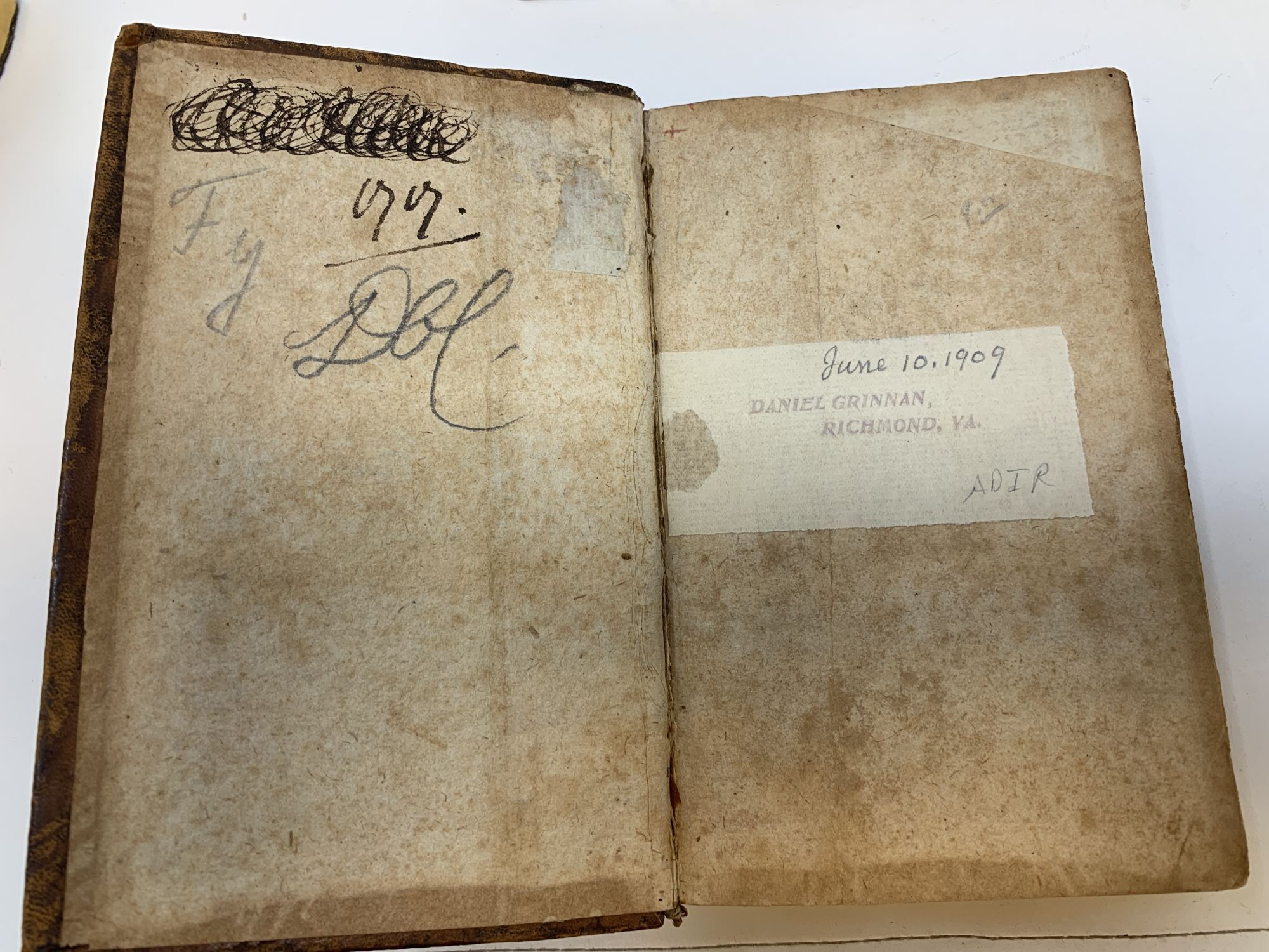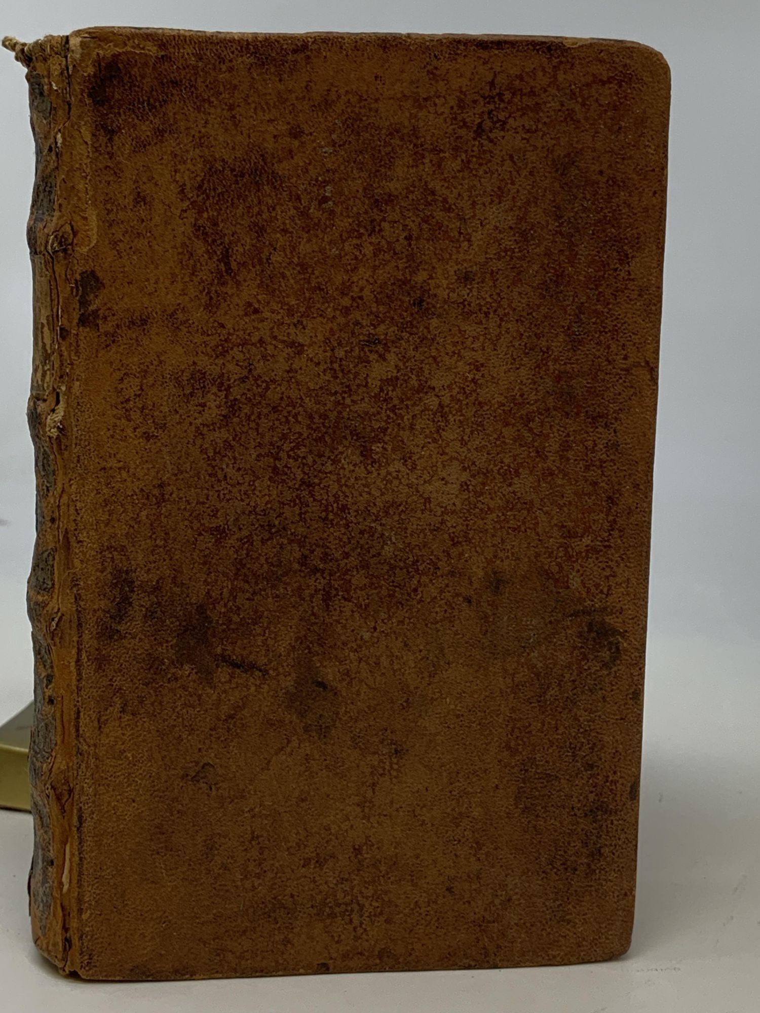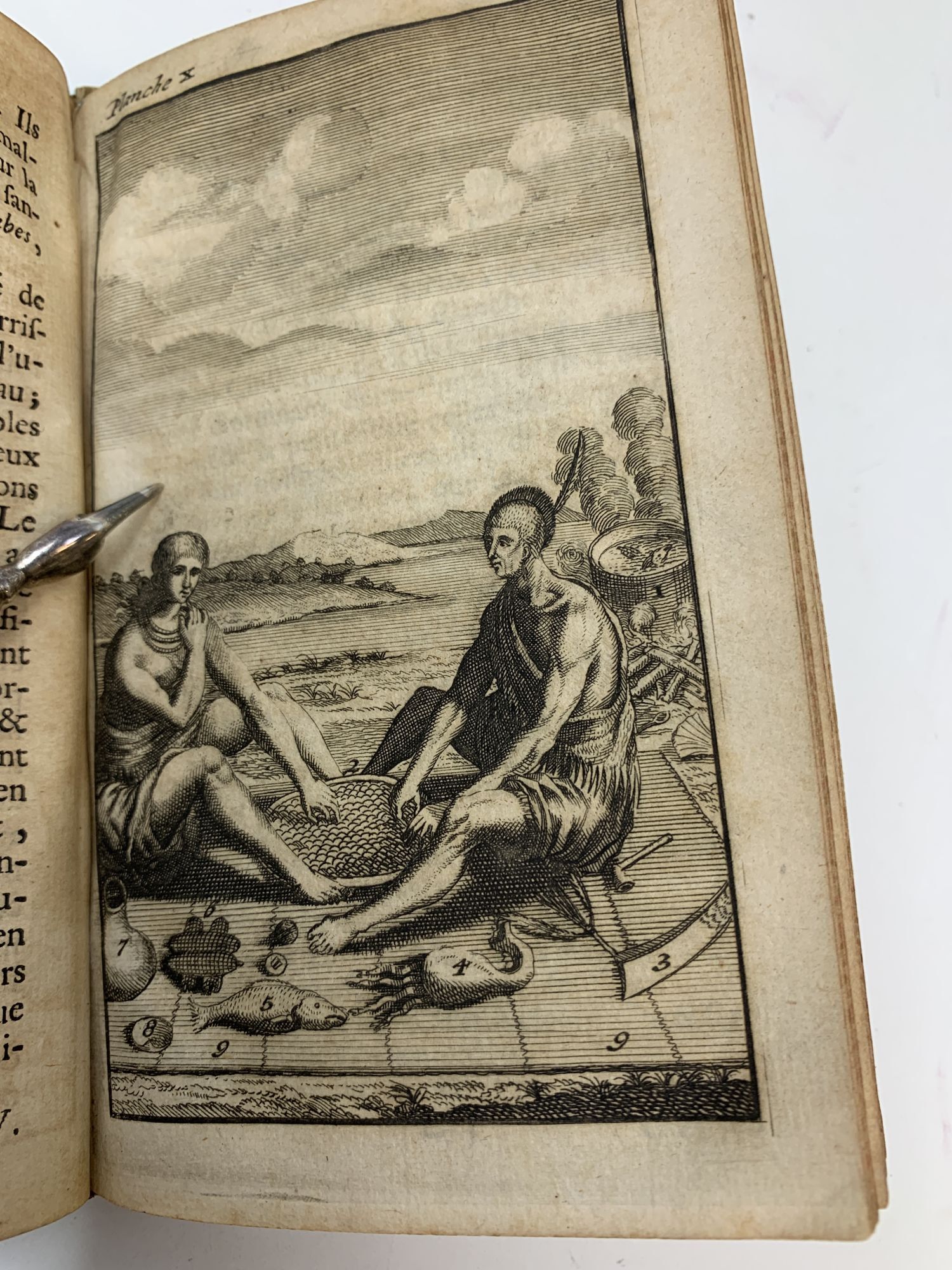 IN FRENCH. 12mo. Contemporary full calf, designed "windowpane" leather binding. (15.08 cm. x 9.50 cm.) Morocco title label. Engraved armorial frontis. Engraved title in black and red. Corner of front free endpaper clipped. 433, [16] pages. Paper lightly browned. 14 plates, including frontis, depicting Native Americans by John White. Folding census of cities (paginated "433"). Index. Sabin 5116 Tooled spine and top headband (worn). Four raised bands/five compartments.Crossed out original owner's name with 1707 date still present, and several other penciled initials to front pastedown, and a small, cut-out piece of laid bond tipped in atop front free endpaper, bearing the name of Daniel Grinnan, Richmond, Virginia, with a penciled-in printed date of June 10, 1909. The first (or second - see notes) translation into French of the 1705 English edition. Previous owner's manuscript signature, "Hannov.", and 1717 date to title page adjacent to large decorative vignette. Upside down stamp within oval of "Hannov. Societ. Bibliothek" to verso of title page. Light toning to pages throughout, but not too obscure. 432 pp., followed by a fold-out chart, and a complete "Table des Matieres" (Index). Beverley's book in English is very scarce. Robert Beverley was "the only native Virginia author before the Nineteenth-century to offer illustrations of the native inhabitants of Virginia to European, and later American audiences. John White served as artist on Sir Walter Raleigh's first expedition to the area in 1585, and created a series of paintings on Native Virginian life; these were European-created images, and not based on any actual observations amongst Virginia Indians. (paraphrased from Virginia Magazine of History & Biography, 2003, Vol. III, No. 1 [ed. Ruggles[) There exists bibliographic controversy as to which of the two French editions (this one, published in Amsterdam, or the other, published in Orleans) is the first French appearance. Chicken or egg, some scholars consider them interchangeable. (Pilpul) ".A work of considerable merit, particularly relative to the numerous Indian tribes, then resident in the State, but nor extirpated or greatly diminished." (Pinkerton). Beverley is the best authority concerning the particular subjects delineated in his quaint and agreeable pages; and his owrk affords the most vivid, comprehensive, instructive, and entertaining picture of Virginia at the date of his writing that is to be found. (Sabin 5116 & 5117) The third part (of four parts) "contains a remarkable study of the domestic and institutional life of the Indians." This is the first account of this colony penned by a native, and the best contemporary record of its aboriginal tribes and of the life of its early settlers. [Howes B-410].