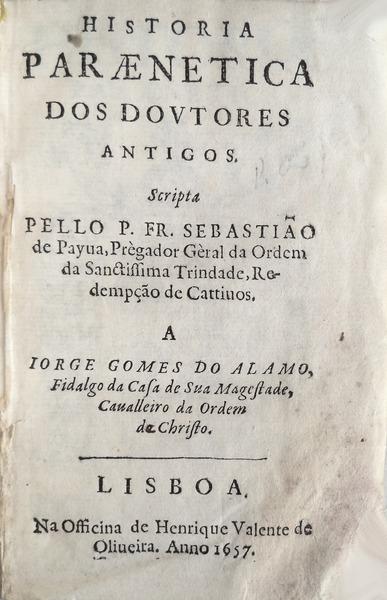 Scripta PELLO P. FR. SEBASTIÃO de Payva, Prègador Gèral da Ordem da Sanctissima Trindade, Redempção de Cattivos. A IORGE GOMES DO ALAMO, Fidalgo da Casa de Sua Magestade, Cauallleiro da Ordem do Christo. LISBOA. Na Officina de Henrique Valente de Oliueira. Anno 1657. In 8º (de 14x9 cm) com [viii], 343 págs. Encadernação da época em pergaminho flexível com título manuscrito na lombada. Ilustrado com uma gravura do escudo de armas de Gomes do Alamo. Exemplar com coifas e cantos das pastas cansados, sinais de manuseamento nas dianteiras das primeiras páginas, reparações de cortes antigos nas primeiras páginas sem perda da mancha gráfica, vestígios de humidade no canto inferior direito de toda a obra e leve trabalho de traça nas dianteiras das últimas páginas. Exemplar corresponde à segunda variante mencionada por Inocêncio, apresentando o salto na paginação (176 para 178, algo coladas neste exemplar) conforme menciona Inocêncio, sem perda da sequência do texto, e encontrando-se a partir daí as páginas pares no anverso. Contém um tratado da arte de prégar (parénese), com exortações aos fiéis, aos clérigos e aos Papas, mostrando qual a forma de redigir os discursos morais, e com a história de como foram reunidos os primeiros evangelhos e os sermonários (ou parenética). Obra do mesmo autor que ?profetizou? a vinda do Quinto Império. Inocêncio VII, 221: 'Fr. Sebastião de Paiva, Trinitário, Mestre de Teologia, e Pregador geral na sua Ordem. Professou em 1621. Foi natural de Lisboa, e morreu em 1659. Ou por moda, ou por paixão, mostrou-se defensor acérrimo dos Sebastianistas, fazendo a apologia desta crença em escritos, que, segundo Barbosa, ficaram inéditos, e se conservavam no mosteiro da Trindade. É de supor que ficassem de todo consumidos no incêndio que reduziu a cinzas este convento, com as suas oficinas e livraria, ainda antes do terremoto de 1755. 131) (C) Historia Paraenetica dos Doutores Antigos. Lisboa, por Henrique Valente de Oliveira, 1657. 8.º de VI 313 pag., havendo um salto na numeração que passa de pag. 176 a 178. Contém resumidas as vidas de Origenes, Tertulliano, S. Cypriano, Sancto Attanasio, S. Gregorio Nazianzeno, Santo Ambrosio e S. João Chrysostomo. Conservo dois exemplares deste livro com rostos diferentes. Um deles tem, afora o frontispício impresso, outro gravado em chapa de metal. Ao segundo falta esse rosto gravado, porem há em seu lugar um escudo d'armas, igualmente de gravura, que no primeiro se não encontra'. Language: Português / Portuguese Location/localizacao: M-3-B-3.