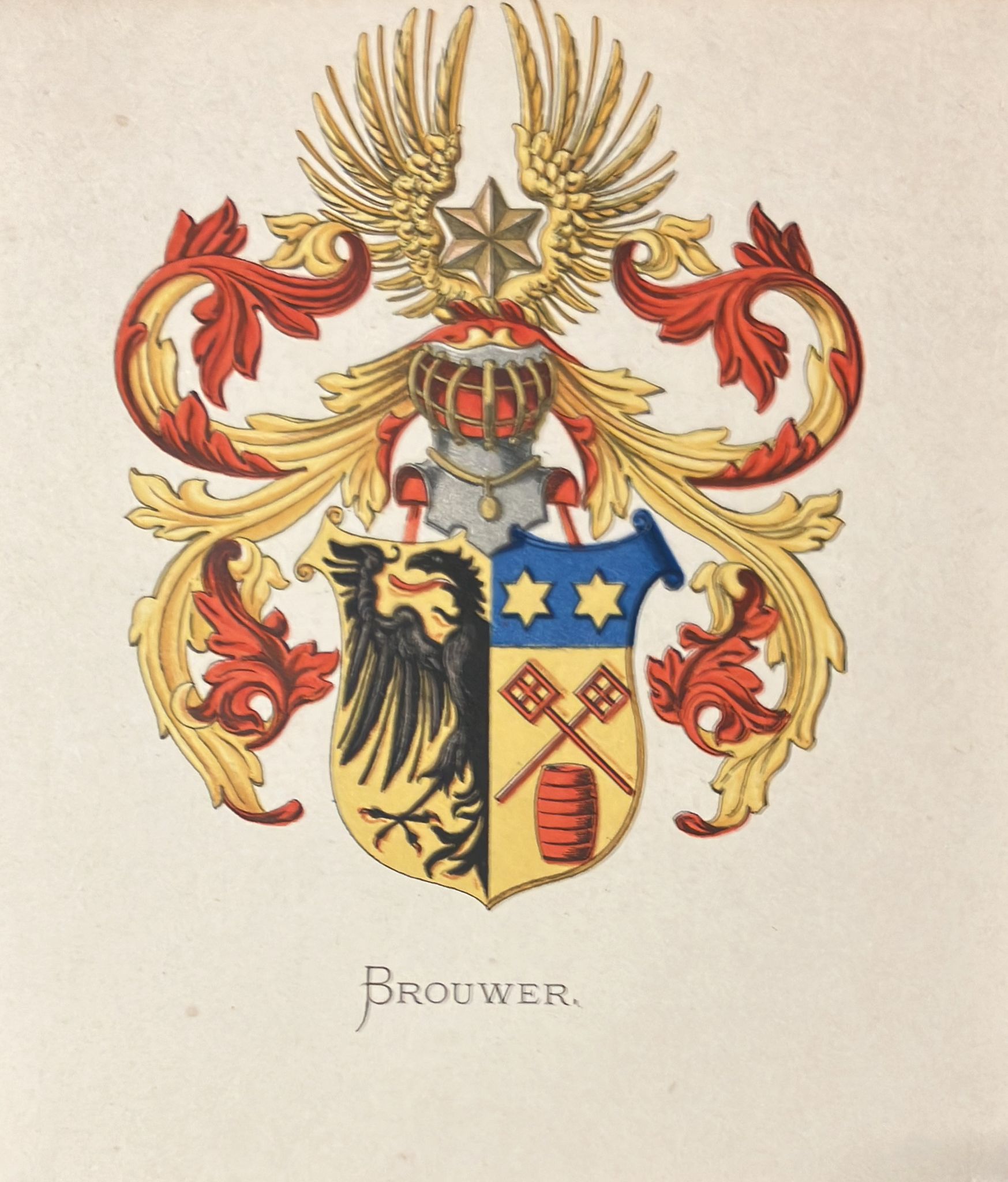 [Heraldic coat of arms] Coloured coat of arms of the Brouwer family, family crest, 1 p.