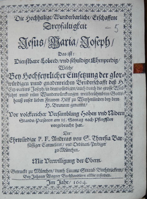 Die Hochheilige/ Wunderbarliche/ Erschaffene Dreyfaltigkeit Jesus/ Maria/ Joseph/ Das ist: Dienstbare Lobred/ und schuldige Ehrnpredig / Welche Bey Hochfeyrlicher Einsetzung der glorwürdigen unnd gnadenreichen Bruderschafft deß H. Ertz-vatters Joseph/ in dem würdigen/ auch durch die grosse Walfahrt unnd vilen Wunderwürckungen weitberühmbten Gottshauß unser lieben Frawen Hilff zu Weyhenlinden bey dem H. Brunnen genannt/ Vor volckreicher Versamblung Hohen und Nidern Stands-Personen am 15. Sontag nach Pfingsten vorgebracht hat. Der Ehrwürdige P.F. Andreas von S. Theresia Barfüssiger Carmeliter/ und Ordinari-Prediger zu München.