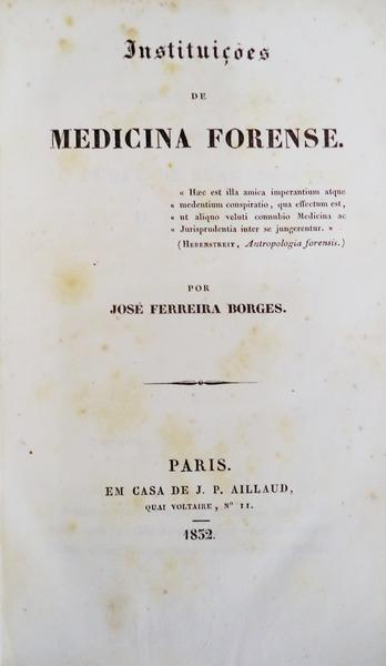 ?Haec est illa imperantium atque medentium comspiratio, qua effectum est, ut aliquo veluti conúbio Medicina ac Jurisprudentia inter se jungerentur. (Hebenstreit, Antropologia forense)? Por? Em casa de J.P. Aillaud, Paris. 1832. De 21x13 cm. In 8º com [VIII] - XVI-576 págs. Encadernação da época, com lombada e cantos em pele. Obra dedicada ao Imperador D. Pedro IV, em Londres a 7 de Novembro de 1832. Inocêncio IV, 327 e 329: ?Instituições de Medicina Forense. París, 1832. Este livro, dedicado pelo auctor ao Duque de Bragança, foi o primeiro que n?esta matéria appareceu em lingua portugueza, e escripto por portuguez. Ferreira Borges deu n?elle provas da sua vasta erudição, mostrando que lêra e meditára todos os auctores citados. Há segunda edição. 1840. 8.o gr. JOSÉ FERREIRA BORGES, Bacharel formado em Canones pela Universidade de Coimbra em 1805: Advogado na cidade do Porto, sua pátria, desde 1808 até 1820; Secretario da Junta da Companhia dos Vinhos do Alto-Douro em 1818; Membro da Junta Provisional do Governo Supremo do Reino, proclamada no dia 24 de Agosto de 1820; para cujos successos concorreu tão activamente como consta das suas biographias, e das Revelações e Memorias do seu consocio Xavier de Araujo; Deputado ás Côrtes constituintes em 1821; Conselheiro de Estado em 6 de Março de 1823; emigrado em Londres desde Junho do mesmo anno até Fevereiro de 1827; e novamente em Fevereiro do anno seguinte até Setembro de 1833; Supremo Magistrado do Comércio, e Juiz Presidente do Tribunal Comercial de segunda instancia, por Carta Régia de 18 de Setembro do mesmo anno; demitido de todos os cargos, por assim o haver requerido, em 19 de Septembro de 1836. Nasceu no Porto em 1786, e aí morreu em 1838.? Language: Português / Portuguese Location/localizacao: I-10-H-17.