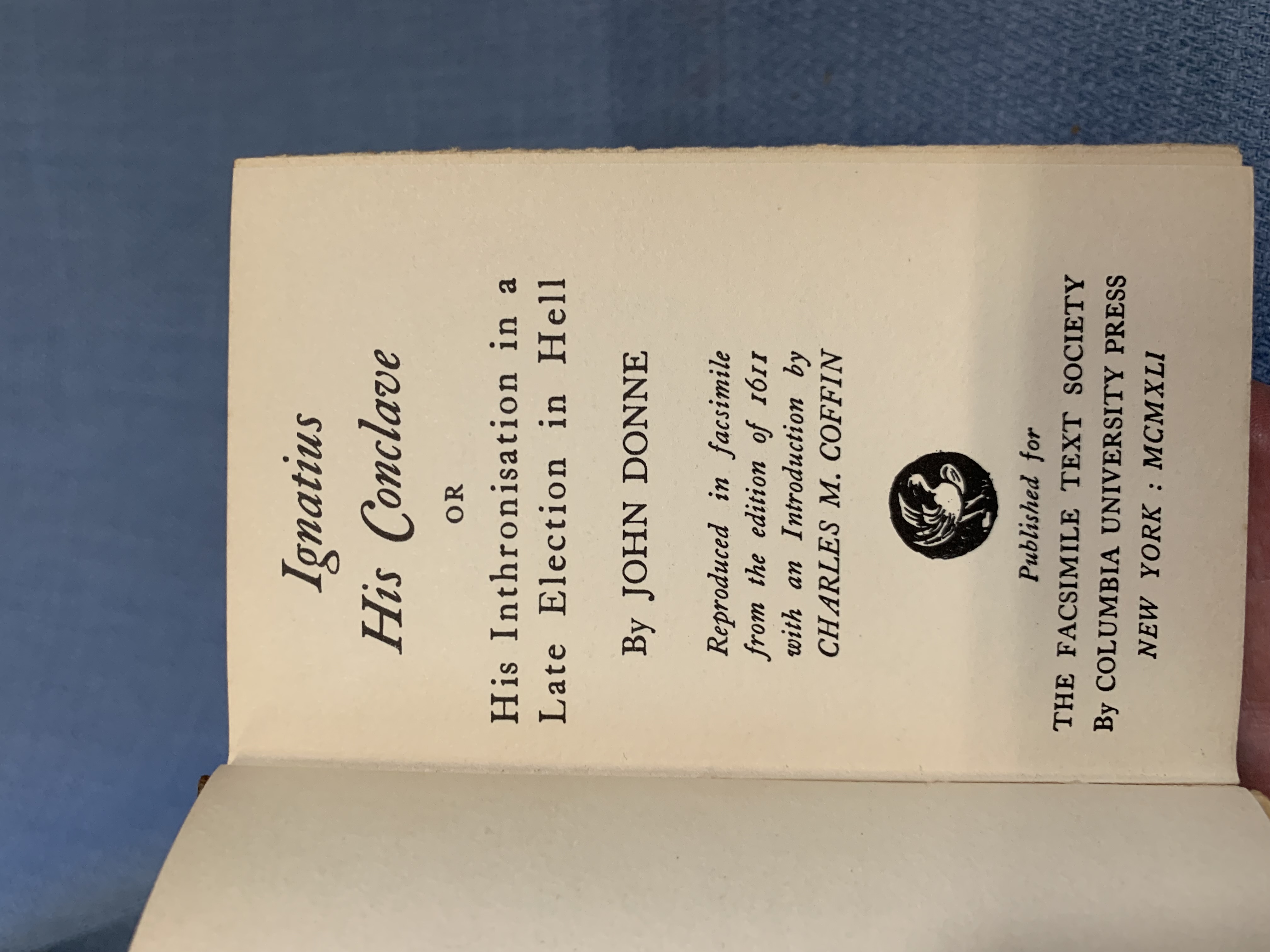 Add to basketIgnatius His Conclave or His Inthronisation in a Late Election in Hell. Reproduced in Facsimile from the edition of 1611 with an Introduction by Charles M. Coffin. Publication no. 53 of the Facsimile Text Society. 32mo. Xxiii,143pp., plus An Apology for Jesuites (4pp.). A fine copy in brown cloth boards with gilt spine titling. 4 7/8 by 3 1/8 inches.
