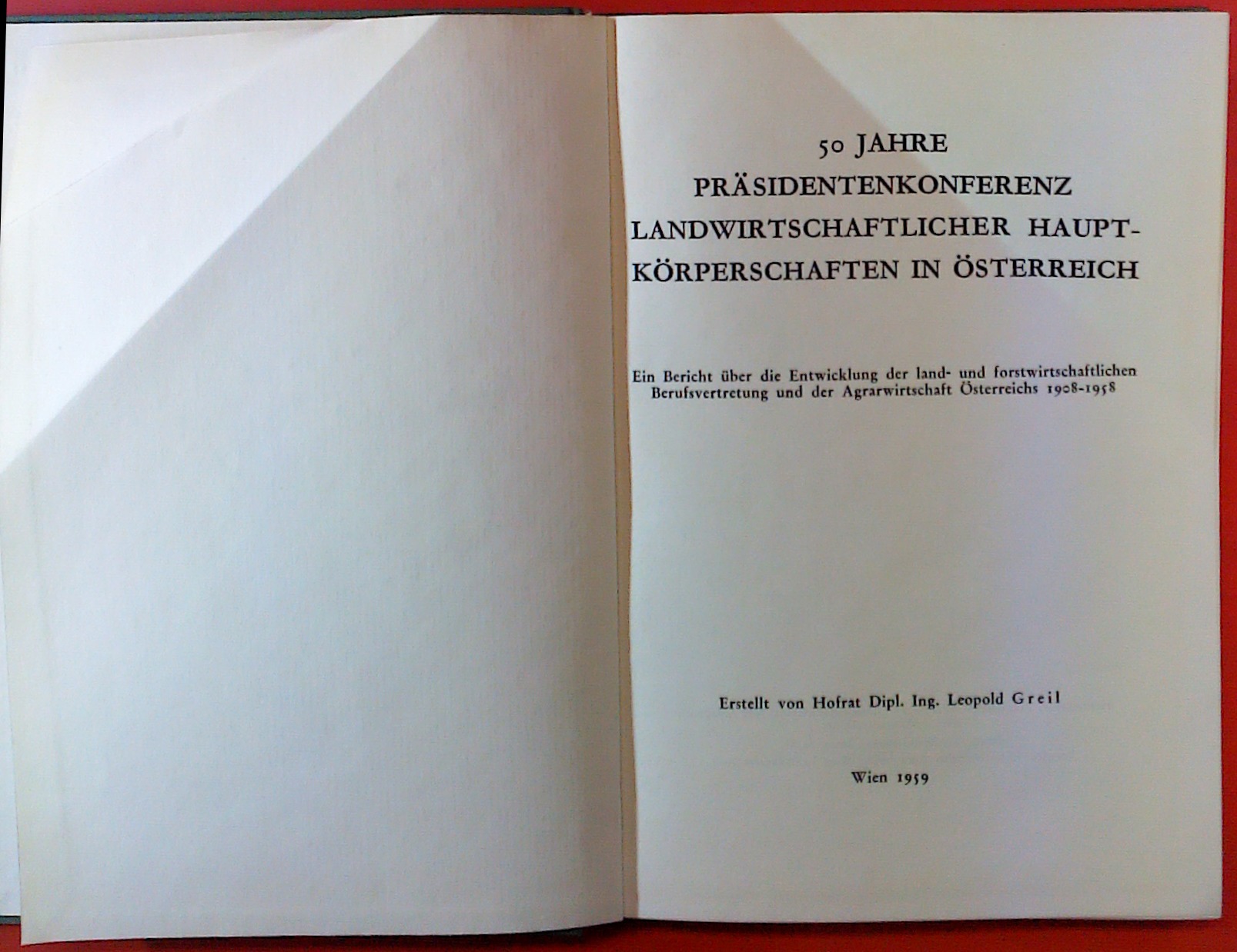 50 Jahre Präsidentenkonferenz Landwirtschaftlicher Hauptkörperschaften in Österreich : ein Bericht über die Entwicklung der land- und forstwirtschaftlichen Berufsvertretung und der Agrarwirtschaft Österreichs 1908 - 1958 / erstellt von Leopold Greil