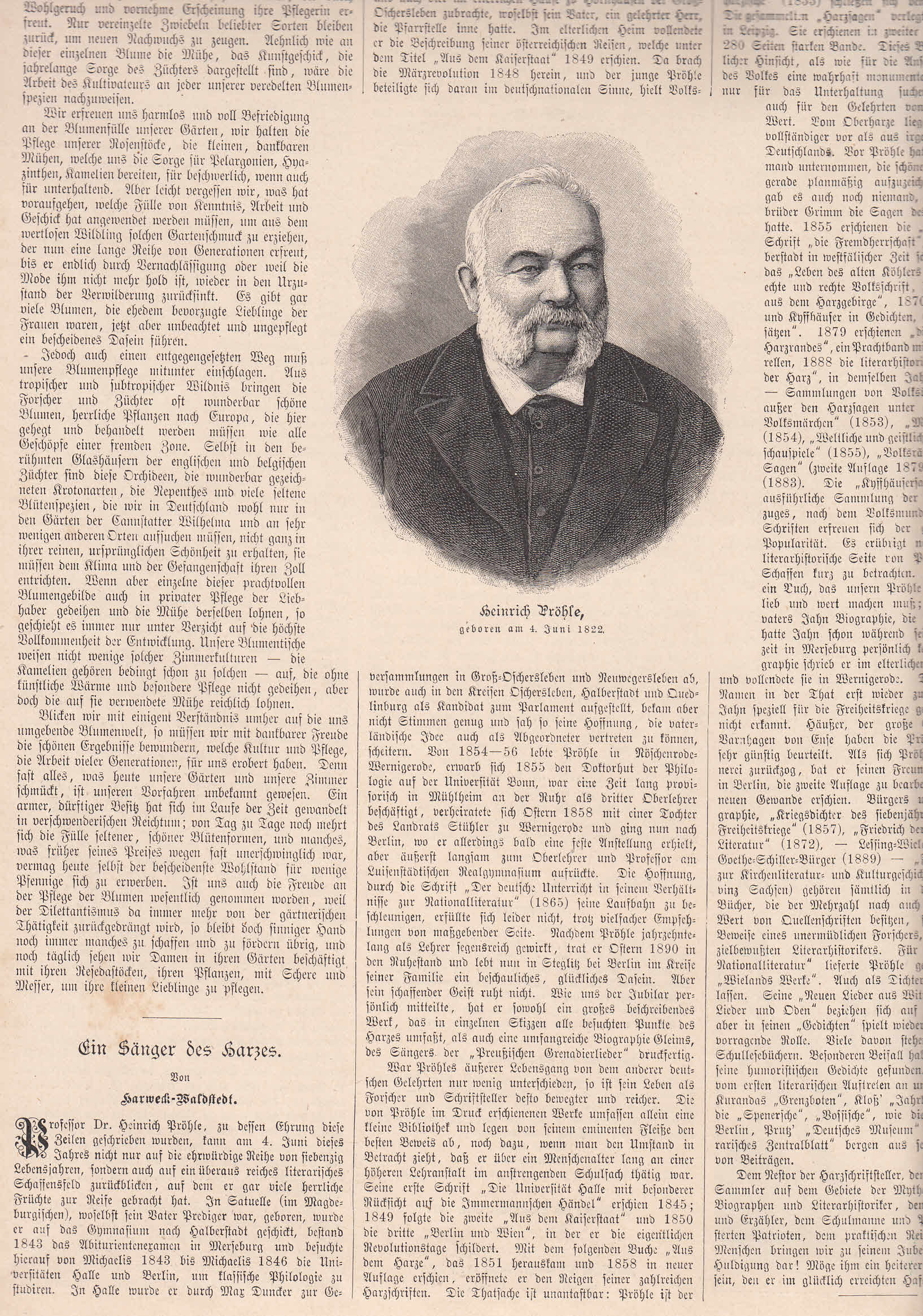 * 4. Juni 1822 in Satuelle, Lehrer und Schirftsteller. Brustbild zu seinem 70igsten Geburtstag mit einem Artikel "Ein Sänger des Harzes" von Karweck-Waldstedt auf einem Blatt.