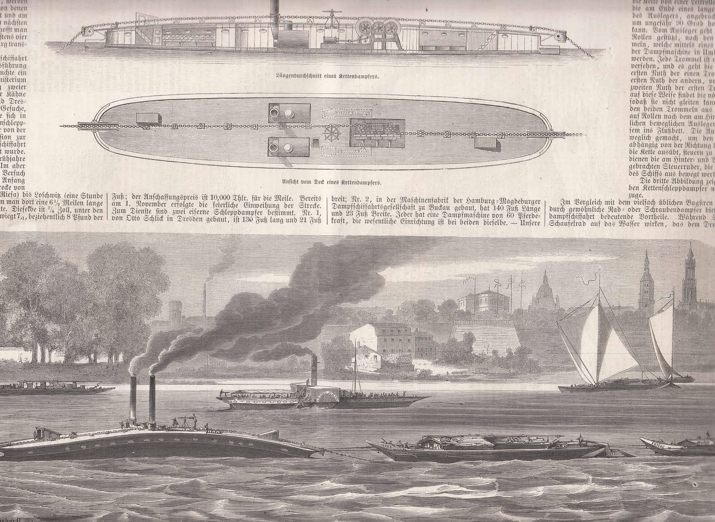 Kettenschleppdampfer auf der Elbe bei Dresden. 3 Abbildungen mit einem Artikel "Die Kettenschleppschiffahrt" auf 2 Seiten. Ein kleiner Teil des Artikels in Kopie. Zeigt: 1. Der Kettenschleppdampfer, Ansicht von der Elbe aus. 2. Längendurchschnitt. 3. Ansicht vom Deck.