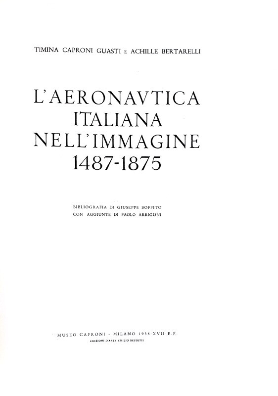 L'aeronautica italiana nell'immagine. 1487-1875. Bibliografia di Giuseppe Boffitto con aggiunte di Paolo Arrigoni. Milano, Edizioni d'Arte Emilio Bestetti, 1938.