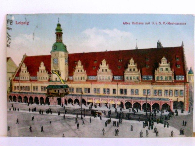 AK Leipzig. Altes Rathaus mit U.S.S.R. - Mustermesse. Platzpartie, Gebäudeansicht, viele Passanten