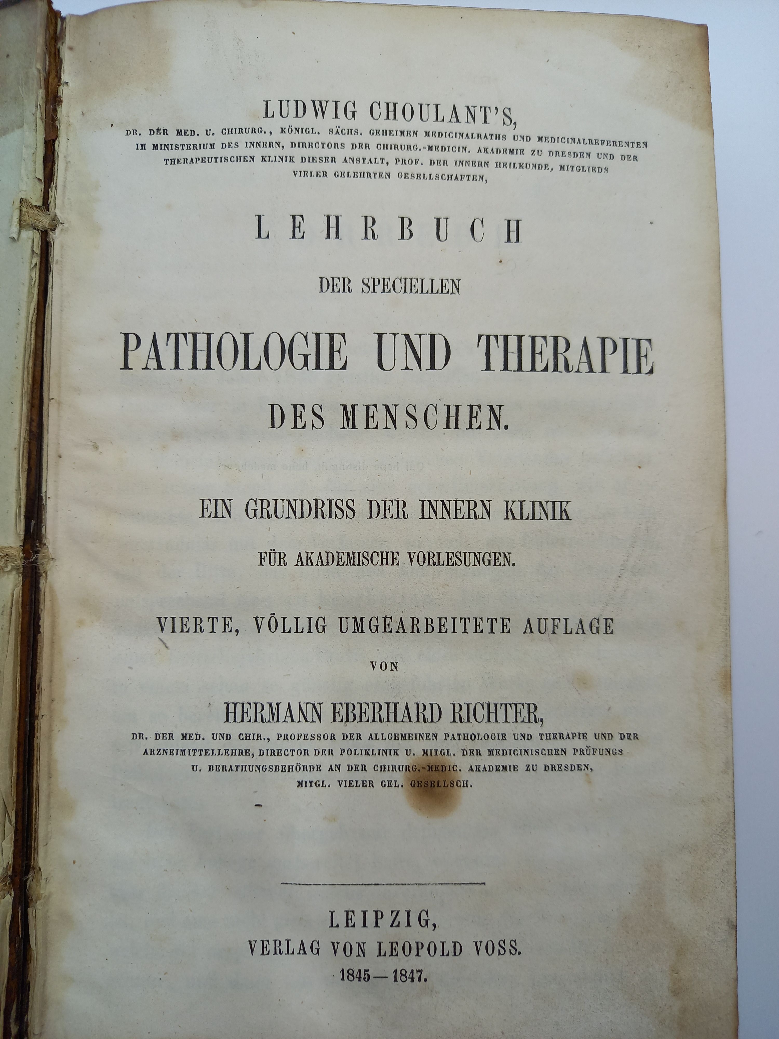 Ludwig Choulant s Lehrbuch der speciellen Pathologie und Therapie des Menschen. Ein Grundriss der innern Klinik für akademische Vorlesungen (Vierte, völlig umgearbeitete Auflage von Hermann Friedrich Richter); Erster Band ( von 2 erschienenen Bänden )