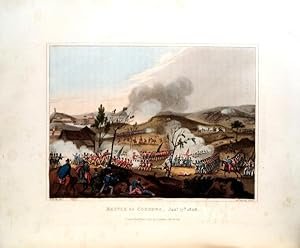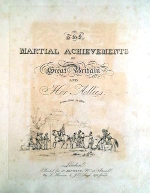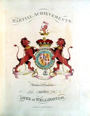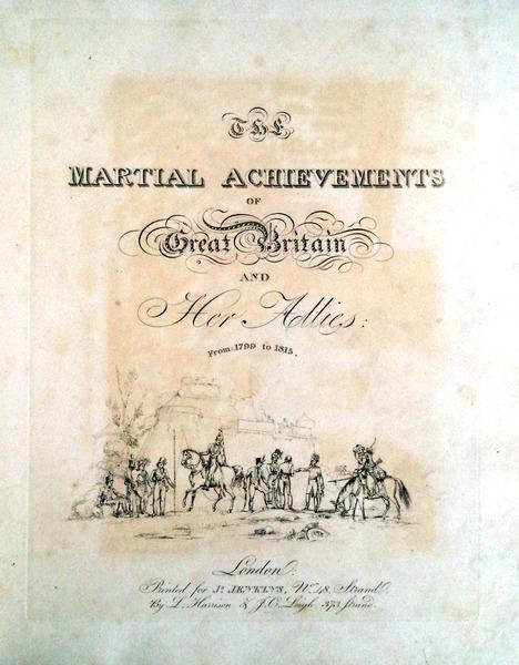 FROM 1799 TO 1815. London: Printed for Js. JENKINS. [1814-15]. In folio de 34,5x27,7 cm. Com viii págs, (ii págs), [59 fólios de texto + 53 gravuras]. Encadernação da época com lombada e cantos em pele. Cortes das folhas dourados. Ilustrado com 53 gravuras, a dedicatória com o brasão de Wellington colorido, 52 gravuras de cenas militares coloridas à mão com água-tinta e 1 frontispício não colorido aberto em chapa. Primeira edição. Magnífico exemplar no seu estado original, encontra-se em excelente estado de conservação. Apresenta margens muito generosas, preserva quase todas as folhas originais de papel vegetal que protegem as gravuras e contém, na folha anterior de guarda, um ex-libris armoriado de [Major] Gerard F. T. Leather. Gerard Frederick Towlerton Leather, Edimburgo 1865 - 1941, dos Northumberland Fusiliers, mais tarde Coronel, posto em que se reformou. Esta é a mais famosa obra com o registo das principais batalhas do exército britânico nas guerras napoleónicas. Com exceção das gravuras 25 e 31, retrata em ordem cronológica as acções militares britânicas durante as campanhas de Napoleão, com particular incidência nos eventos na Península Ibérica, desde a derrota e retirada de La Coruña até à vitória em Talavera e os feitos do exército Anglo-Português orientado pelo brilhante estratega Duque de Wellington, apoiado pelos irregulares espanhóis não afectos a José Bonaparte. 6 das gravuras reportam a batalhas no território português, como Roliça, Vimieiro, Grijó, Bussaco, Barrosa e Pombal, bem como a muitas outras a batalhas no território de Espanha, na Raia, batalhas em que o contributo do exército Anglo-Português foi decisivo. As gravuras das batalhas foram executadas a partir de desenhos de William Heath e abertas em chapas por T. Sutherland, D. Havell, M. Dubourg e J. Hill. 1. Frontis. [Vignette title: "Martial Achievements"] 2. Title page. 3. "Martial Achievements" Coat of Arms. 4. Storming of Seringapatam - May 4th 1799. 5. Defence of the Breach at St. Jean d"Acre, May 8th 1799. 6. Landing of the British Troops in Egypt, March 8, 1801. 7. Death of Sir Ralph Abercromby, March 21, 1801. 8. Battle of Maida - July 4th 1806. 9. Storming of Monte Video - Feb 3rd 1807. 10. Battle of Roleia (Roliça) - Aug 17th 1808. 11. Battle of Vimiera (Vimieiro) - Aug 21st 1808. 12. Battle of Corunna, Jan 17th 1809. 13. Death of Sir John Moore, Jan 17, 1809. 14. Battle of Grigo (Grijó) - May 11th 1809. 15. Battle of Salamonda - May 16th 1809. 16. Battle of Talavera, July 28th 1809. 17. Battle of Busaco (Bussaco) - Sept 27th 1810. 18. Battle of Barrosa, March 5th 1811. 19. Battle of Pombal - March 12th 1811. 20. Defeat of a French Division before Badajos - March 25th 1811. 21. Battle of Fuentes d"Onoro - May 5th 1811. 22. Battle of Albuera - May 16th 1811. 23. Marshall Beresford disarming a Polish Lancer, at the Battle of Albuera - May 16th 1811. 24. Siege of Badajoz, June 1811. 25. Storming of Ciudad Rodrigo, Jan 19th 1813. 26. Gen Sir Thomas Picton Storming the Moorish Castle of Badajos. March 31st 1812. 27. Battle of Salamanca, July 22nd 1812. 28. Battle of Seville - Aug 27th 1812. 29. Burning of Moscow, Sept 1812. 30. Flight of Bonaparte from the Battle of Krasnoi. 31. Bonaparte"s Flight in Disguise from Russia, 1811. 32. Battle of castalla, April 13th 1813. 33. Entrance of Lord Wellington into Salamanca; at the Head of a Regiment of Hussars - May 20th 1813. 34. Battle of Morales - June 2nd 1813. 35. Battle of Vittoria, June 21, 1813. 36. Battle of Vittoria, Bringing in the Prisoners. 37. Siege of St. Sebastian - July, 1813. 38. Battle of the Pyrenees, July 28th 1813. 39. Storming of St. Sebastian, Aug 31st 1813. 40. Death of Moreau, before Dresden, Aug 1813. 41. Battle of Bidassoa - Oct 9th 1813. 42. Battle of Leipsic, Oct 19th 1813. 43. Meeting of the Emperors of Russia & Austria, King of Prussia, & Crown Prince of Sweden, in the Great Square of Leipsic, Oct 18th 1813. 44. Blowing Up of the Bridge at Elster. 45. Battle of Nivelle - N.