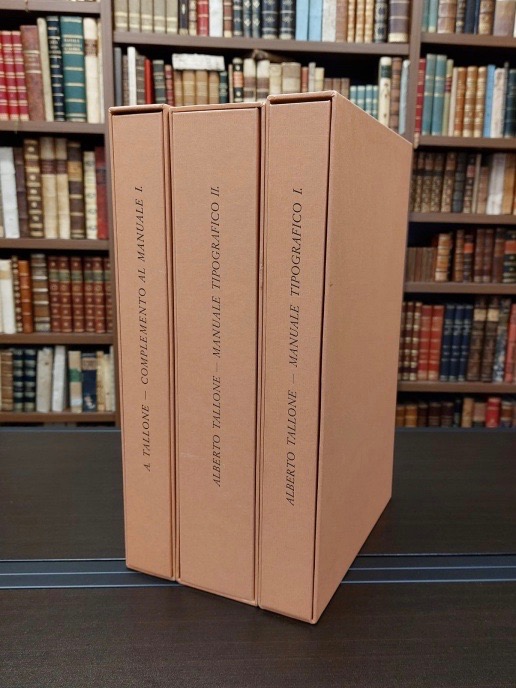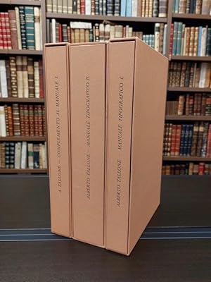 Add to basket3 tomi in-4° (cm. 35,7), pagine non numerate composte con il carattere Tallone ovvero Palladio. Esemplare n. 33 della tiratura di 95 su carta di Sicilia contenente al primo tomo una scelta di 12 frontespizi originali applicati su cartoncino «che varia da volume a volume» [Mavilla p. 233]. Volume primo, tomo primo:Dedicato ai frontespizi e ai tipi maiuscoli tondi e corsivi. Volume primo, tomo secondo: Complemento al Manuale I, dedicato all'estetica degli indici, colophon e prospetti con cartella contenente Prospetti editoriali. Volume secondo:Dedicato all'impaginazione, ai caratteri da testo e ai formati con cartella contenente Esempi di formati. Brossure editoriali a risvolti, titolo in azzurro ai piatti anteriori e ai dorsi, camicie e cofanetti in cartonato di colore albicocca. «Monumento e documento dell'intensa attivitą tipografica dei Tallone [.], opera unica nel panorama editoriale europeo per la sua particolare struttura» [Mavilla p. 233]. Superbo esemplare.