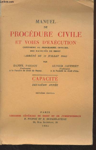Manuel de procédure civile et voies d'exécution, conforme au programme officiel des facultés de droit (arrêté du 12 juillet 1956) - Capacité, 2e année