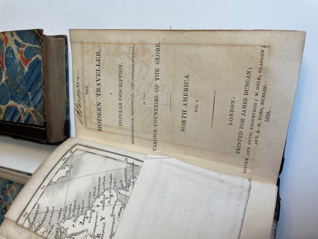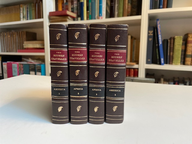 Add to basketThe Modern Traveller, A popular description, Geographical, Historical and Topographical, Printed for James Duncan, London, Oliver and Boyd, America 1 & 2, Africa 2 & 3. With maps. Original marbled boards but rebacked in brown leather with gilt tooling. Fresh endpapers. Red morocco title label and gilt detailing to spine. Maps present in America books. Africa 1 missing.