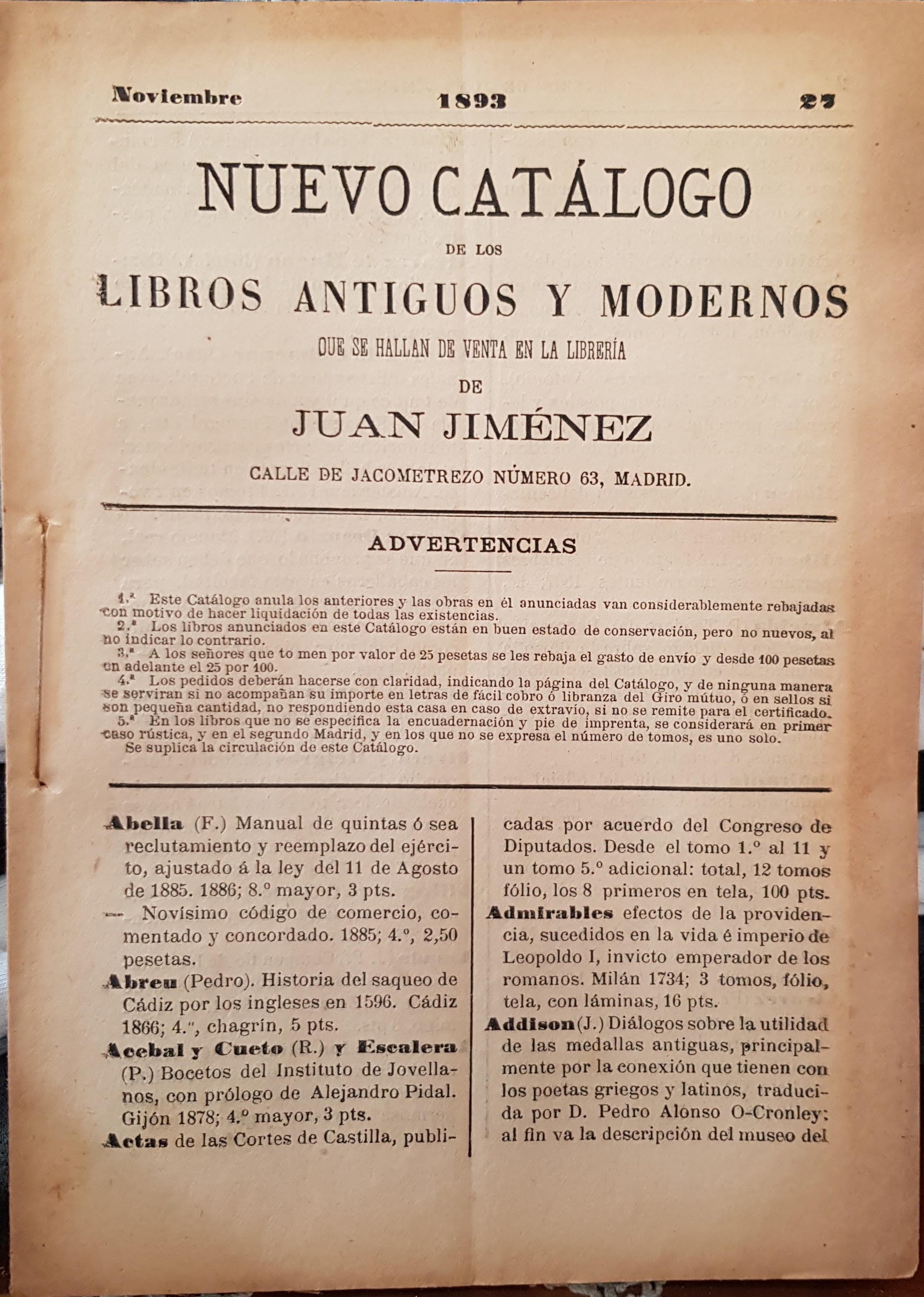 NUEVO CATÁLOGO DE LOS LIBROS ANTIGUOS Y MODERNOS. A LA VENTA EN LA LIBRERÍA JUAN JIMENEZ. Noviembre 1893
