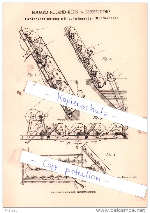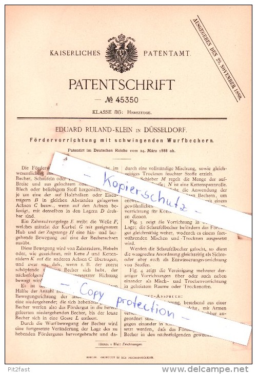 Original Patent - Eduard Ruland-Klein in Düsseldorf , 1888 , Fördervorrichtung mit Wurfbechern !!!