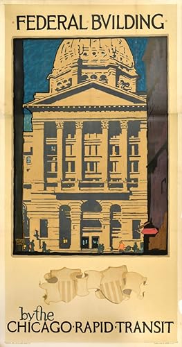 Add to basketOriginal vintage travel poster - Federal Building by the Chicago Rapid Transit - featuring great artwork by Willard Frederick Elms (1900-1956) depicting silhouettes of people walking in front of the Beaux-Arts style architecture building with the dome against the blue sky background, the text above and with two shields between a ribbon below. Designed by Henry Ives Cobb (1859-1931) the historic Chicago Federal Building was completed in 1905 and housed the Post Office as well as the Civil Service Commission, federal courts and other government offices including the Weather Bureau (Walt Disney worked in this Post Office in 1918, and Al Capone was sentenced for tax evasion at court in 1931); the building was demolished in 1965. Printed by Illinois Litho, Chicago, USA. Large size. Good condition, restored folds, restored tears, restored paper losses, staining, 2 sheet poster backed on linen. Size: 206x119cm.