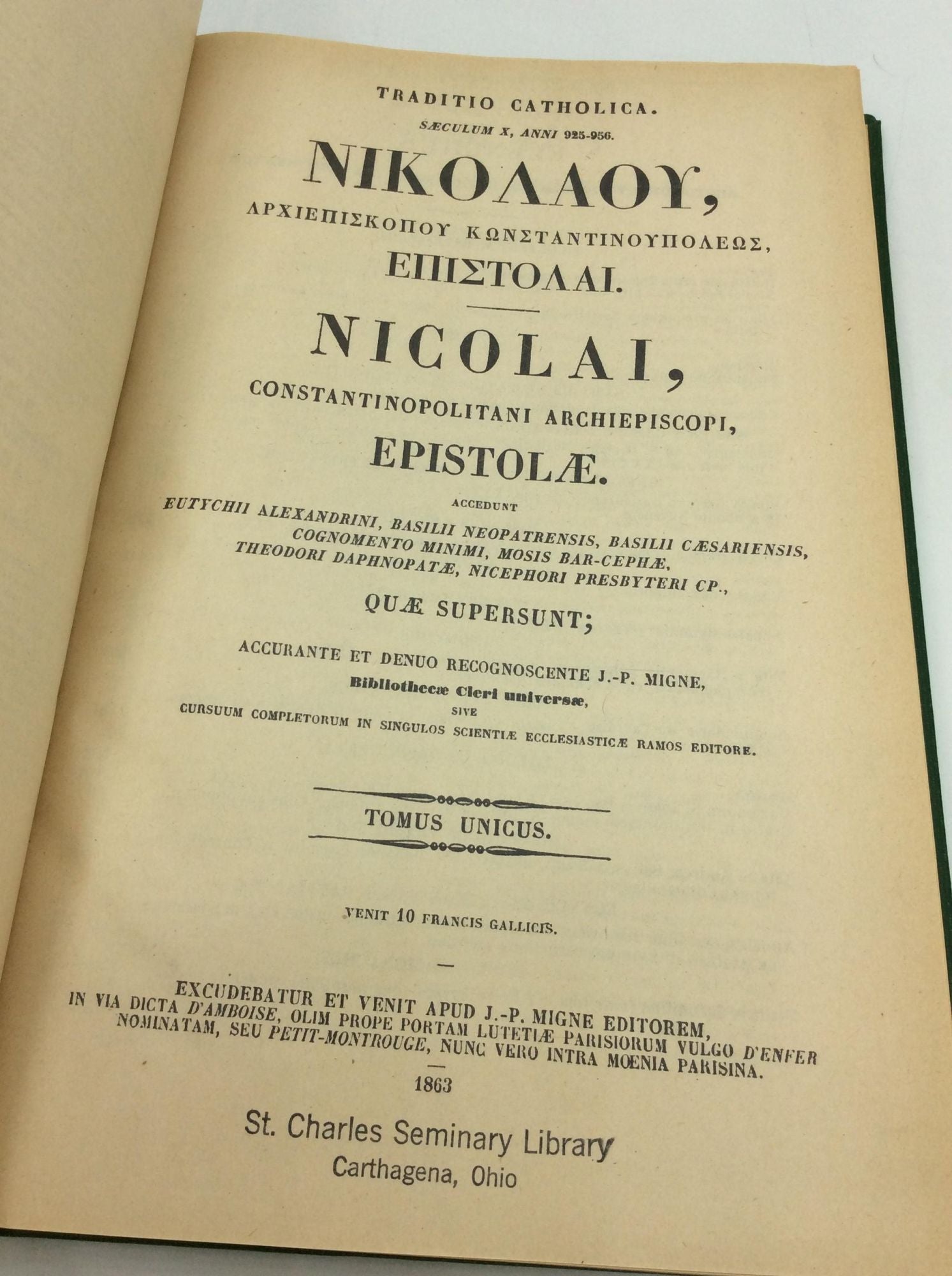 Hardcover, rebound. Ex-seminary library copy. Old paper label on spine, lacks title page, otherwise a clean, tight book in very good condition. Early 20th century reprint. The paper has browned from age. Text in Greek and Latin. A volume fro the famed PATROLOGIA GRAECA series of standard texts of the Greek Fathers of the Church. Seller Inventory # 60315