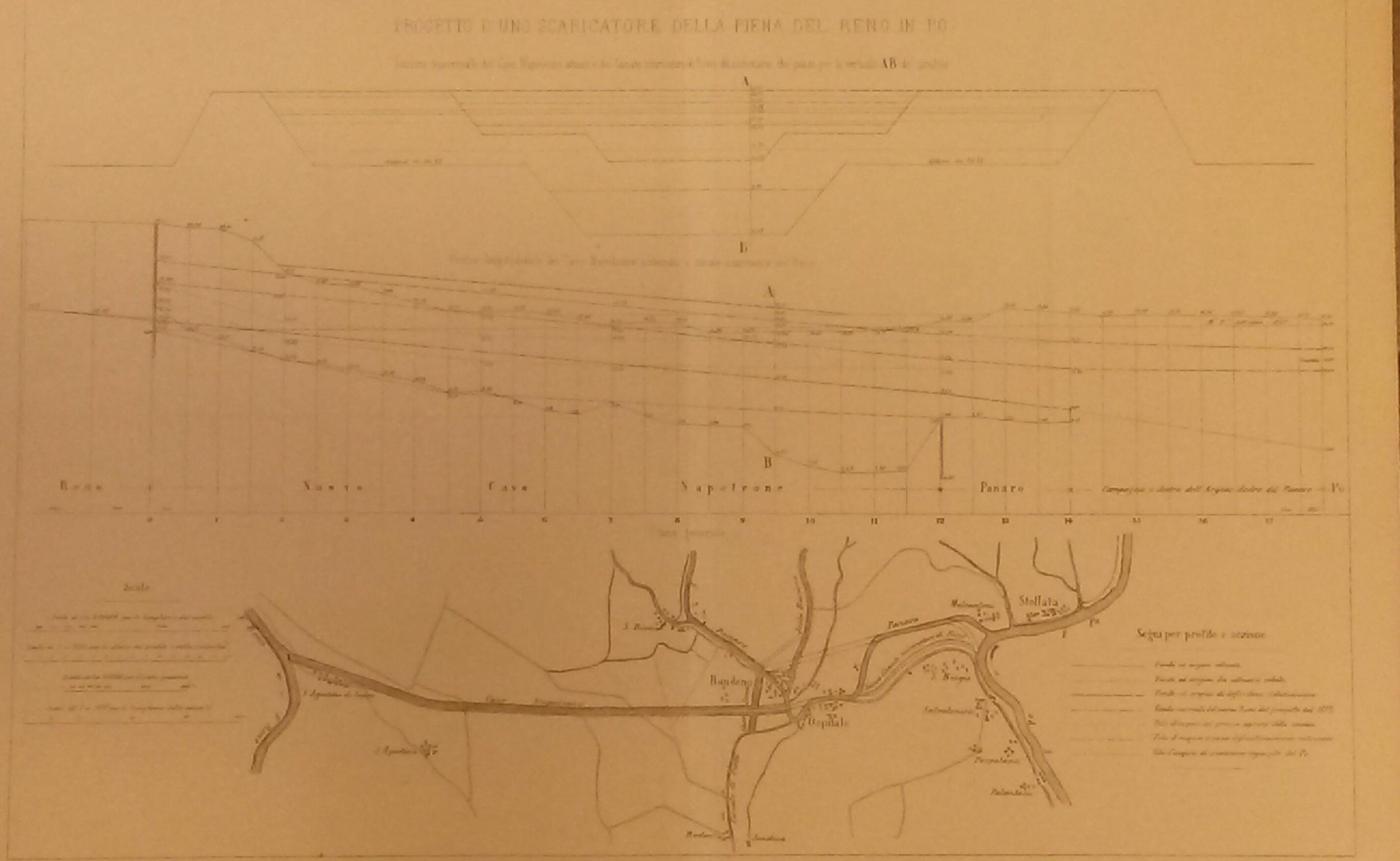 PROGETTO D'UNO SCARICATORE DELLA PIENA DEL RENO IN PO. Tavola illustrativa tratta da "Giornale del Genio Civile".