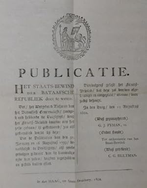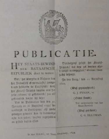 PUBLICATIE. Het staats-bewind der Bataafsche Republiek doet te weten:. dat de publicatiën van den 31. January en 16 Augustus 1799/ betrekkelyk de ventjagery . worden ingetrokken en gesteld buiten effect.