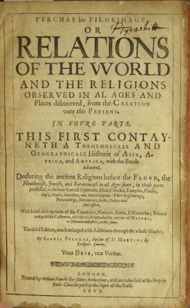 Purchas his pilgrimage, or relations of the world and the religions observed in all ages and places discovered … a theologicall and geographicall historie of Asia, Africa, and America, with the lands adjacent . The third edition, much enlarged