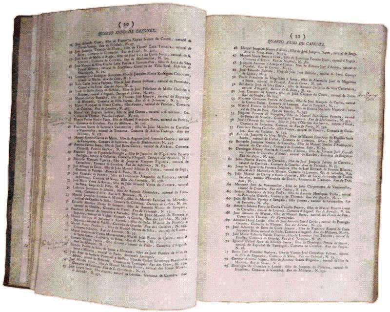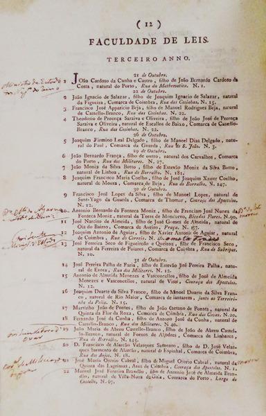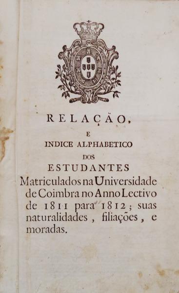 Matriculados na Universidade de Coimbra no Anno Lectivo de 1811 para 1812; suas naturalidades, filiações, e moradas. COIMBRA: NA REAL IMPRENSA DA UNIVERSIDADE. ANNO DE 1812. Seguido de: RELAÇÃO E INDICE ALPHABETICO DOS ESTUDANTES Matriculados na Universidade de Coimbra no Anno Lectivo de 1815 para 1816; suas naturalidades, filiações, e moradas. COIMBRA: NA REAL IMPRENSA DA UNIVERSIDADE. ANNO DE 1815. Seguido de: RELAÇÃO E INDICE ALPHABETICO DOS ESTUDANTES Matriculados na Universidade de Coimbra no Anno Lectivo de 1818 para 1819; suas naturalidades, filiações, e moradas. COIMBRA: NA REAL IMPRENSA DA UNIVERSIDADE. ANNO DE 1819. Seguido de: RELAÇÃO E INDICE ALPHABETICO DOS ESTUDANTES Matriculados na Universidade de Coimbra no Anno Lectivo de 1822 para 1823; suas naturalidades, filiações, e moradas. COIMBRA: NA REAL IMPRENSA DA UNIVERSIDADE. ANNO DE 1822. Seguido de: RELAÇÃO E INDICE ALPHABETICO DOS ESTUDANTES Matriculados na Universidade de Coimbra no Anno Lectivo de 1826 para 1827; suas naturalidades, filiações, e moradas. COIMBRA: NA REAL IMPRENSA DA UNIVERSIDADE. ANNO DE 1827. Seguido de: RELAÇÃO E INDICE ALPHABETICO DOS ESTUDANTES Matriculados na Universidade de Coimbra no Anno Lectivo de 1830 para 1831; suas naturalidades, filiações, e moradas. COIMBRA: NA REAL IMPRENSA DA UNIVERSIDADE. ANNO DE 1830. 6 volumes encadernados em 1 volume. In 4º gr. (de 29x20 cm) com 38, 56, 80, 74, 78 e 46, [1] pags. Encadernação da época com lombada e cantos em pele, cansados. Ferros a ouro desvanecidos na lombada e pastas revestidas a papel decorativo da época. Ilustrado com as vinhetas tipográficas dos brasões da Casa Real nas folhas de rosto de cada Relação, com grande importância no seu conjunto para o estudo da evolução e variantes heráldicas: Rainha D. Maria I / Principe Regente; Reino Unido de Portugal e Brasil; e Dom Miguel. Exemplar apresenta na guarda interior da encadernação um texto manuscrito com uma nova organização do mapa judicial da época. À margem do texto existem anotações manuscritas da época (circa 1830-1840) junto das entradas dos nomes, acrescentando informação coeva a cada um dos mesmos, tais como: ?Lente de Matemática?; ?Contador de fora do Distrito do Porto?; "Juiz em Braga"; "Juiz em Guimarães", "Ministro de Estado"; "Ministro de Estado no Rio de Janeiro"; "Morreu na Forca do Porto"; ?Morreu na Forca de Lisboa?; entre outros. Esta informação da época é particularmente curiosa pois a dita Sociedade dos Divodignos, grupo de estudantes liberais da Universidade de Coimbra, matou dois lentes partidários do rei D. Miguel. Em 1828 foram 13 membros daquela organização secreta que consumaram em Condeixa-a-Nova o assalto à comitiva de lentes e clérigos do Cabido de Coimbra que se dirigiam a Lisboa para saudar o rei absolutista e portadores de uma lista de estudantes liberais a expulsar da Universidade. Os estudantes para a missão de assassinarem os professores foram sorteados na madrugada do dia 18 de Março de 1828. Reuniram-se na Rua do Loureiro. Após a escaramuça os assaltantes foram capturados. Em Junho de 1828, os primeiros nove universitários foram enforcados no cais de Lisboa, perante uma multidão que se acotovelava para assistir à execução colectiva. Manuel Inocêncio de Araújo Mansilha (ver supra RELAÇÃO E INDICE ALPHABETICO DOS ESTUDANTES. 1826, pag. 7) é particularmente referido por outras fontes da época por ter sido baptizado no dia da sua execução. Estas listas de estudantes fornecem-nos importantíssimas informações sobre a suas origens em Portugal e no Brasil, e mais importante ainda a sua morada em Coimbra enquanto estudantes (em alojamentos, em repúblicas, em casas religiosas e noutros locais), podendo uma moderna análise informática demonstrar a rede de ligações entre os mesmos. Vide Camilo Castelo Branco in O Retrato de Ricardina, pág. 68: ?Eram o barcelense Delfino António de Miranda e Matos, chegado momentos antes de Barcelos, Urbano de Figueiredo, o algarviense Francisco do Amor, o irrequieto filho do Porto.
