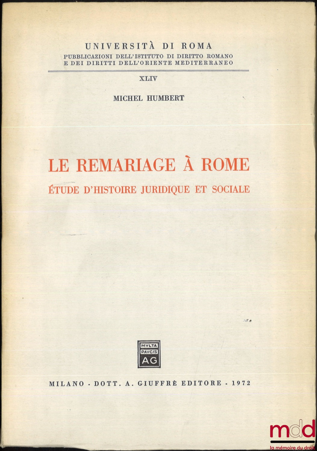 LE REMARIAGE À ROME, ÉTUDE D HISTOIRE JURIDIQUE ET SOCIALE, Università di Roma, Pubblicazioni dell istituto di diritto romano e dei diritti dell oriente mediterraneo, t.XLIV