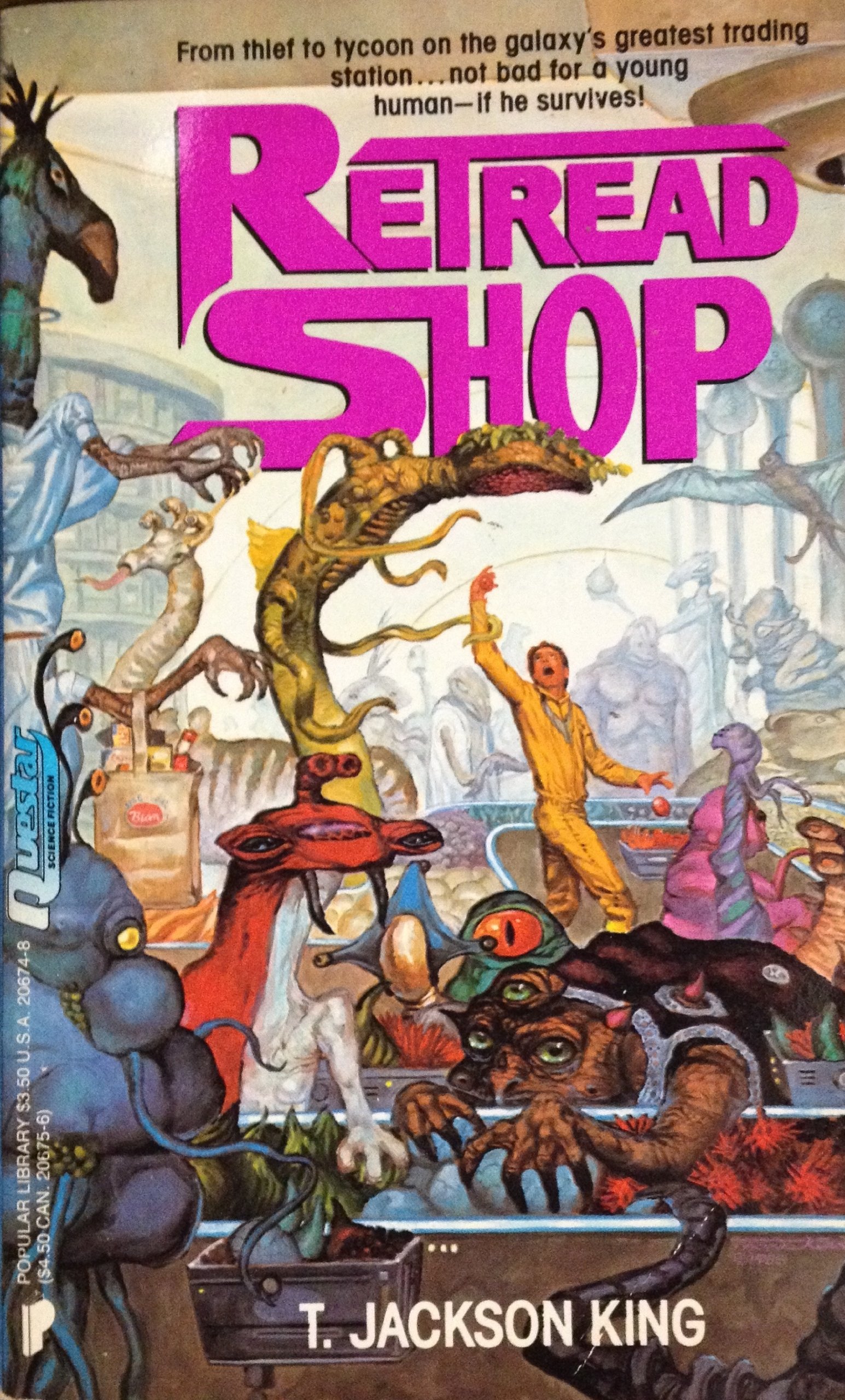 Retread Shop--an Alien-controlled galactic bazaar of unimaginable wealth, rigid caste systems, violent battles and ancient cutthroat rivalries. Young Billy McGuire, its only human and an orphan, was unwanted, scorned, and forced to steal for his living. But now he has a patron, a mysterious Alien trader and a new ambition--to become the Shop's first human Merchant no matter what the odds! On that path to becoming a merchant Billy finds a friend in the panda bear Melisay, a mentor in the plant-anemone Zilkie, a master trader in the matriarch Ding do-wort, some mobile plants that have secrets they might share, and a whale-like creature who runs a Trading Guild that is multi-species and which may just accept him as a Trading student. If, that is, Billy can survive the guild's Pathway of Challenges! If he can survive starships blowing up, laser attacks, battles with deadly robots, and messianic Aliens! And if he can survive the Alien killers of his parents.
