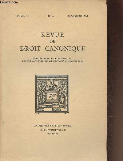 Revue de droit canonique n°4-Toem XI- Décembre 1961-Sommaire: Une nouvelle figure juridique: mariage, sans empêchement avec cautiones par R. Bézac- Des membres de l'Eglise par J. Bernhard- Les recours administratifs J.F. Noubel- Des errore communi par J.