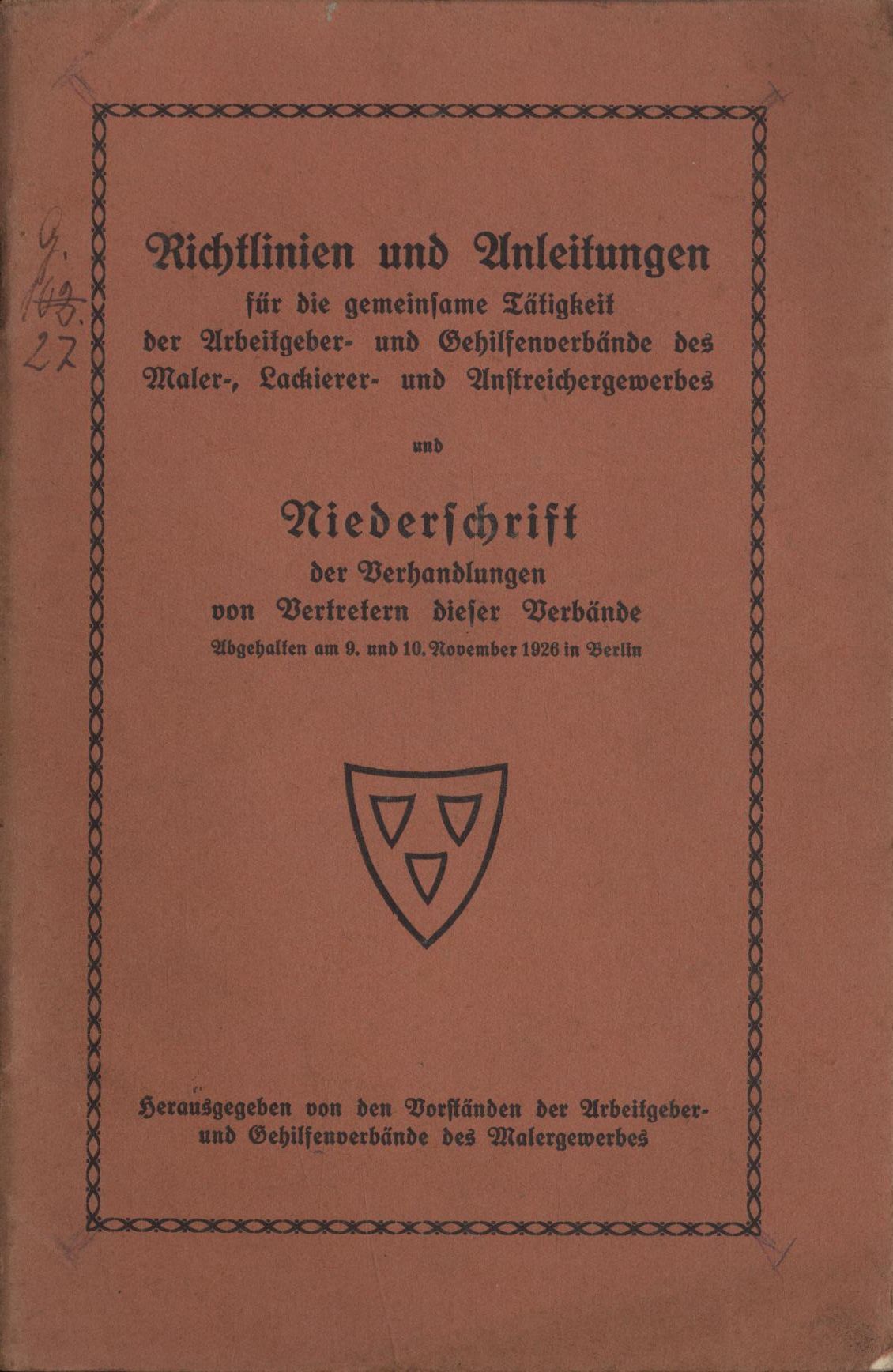 Richtlinien und Anleitungen für die gemeinsame Tätigkeit der Arbeitgeber- und Gehilfenverbände des Maler-, Lackierer- und Anstreichergewerbes und Niederschrift der Verhandlungen von Vertretern dieser Verbände. Abhehalten am 9. und 10. November 1926 in Berlin.