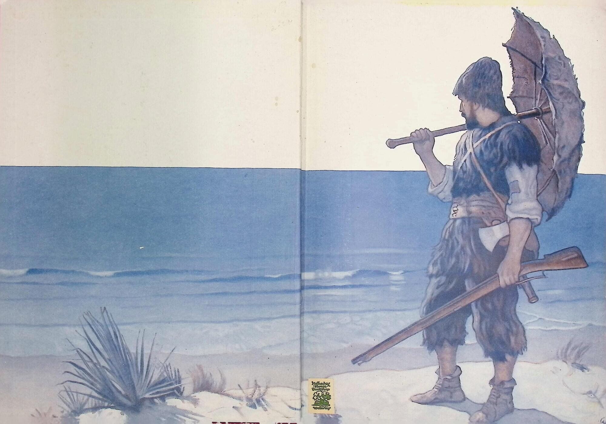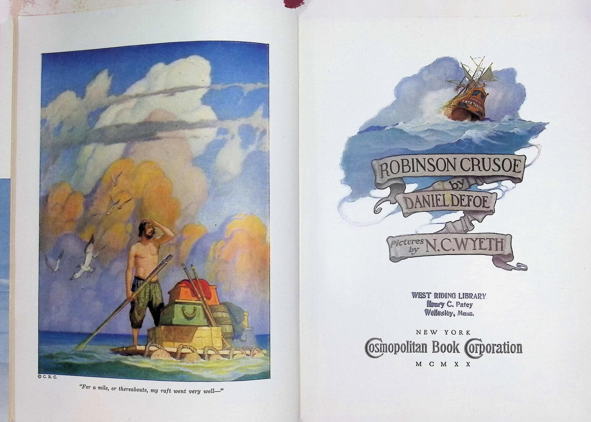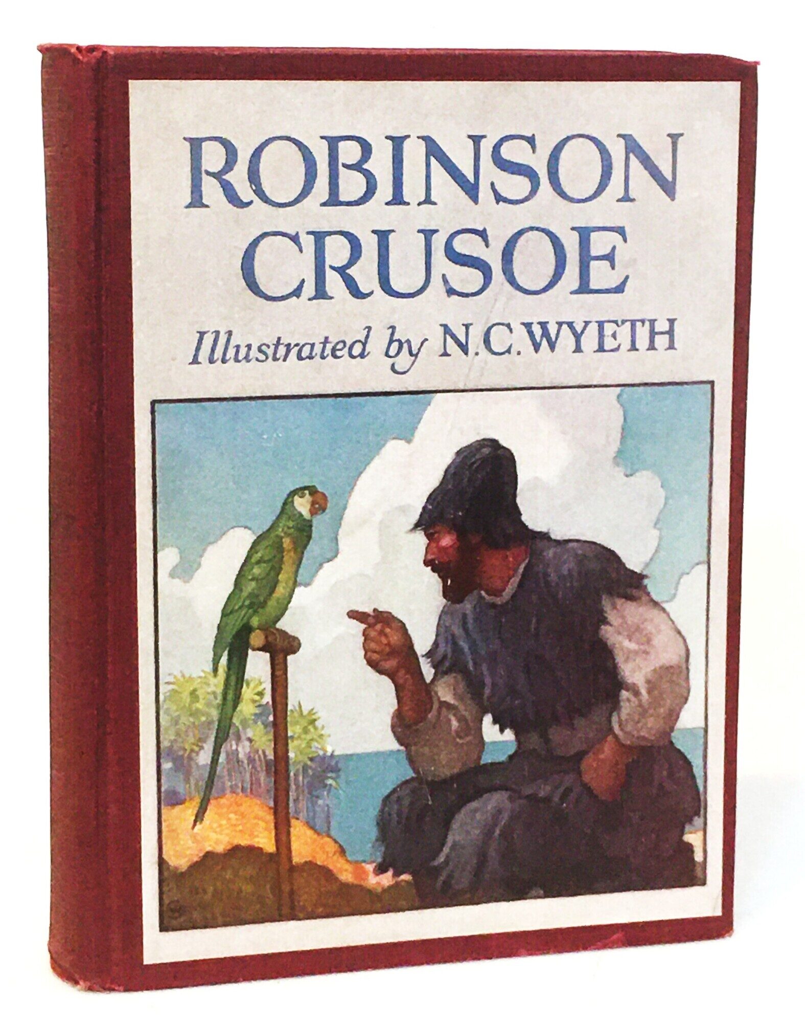 A beautifully preserved example of the 1920 Cosmopolitan edition of Defoe's classic adventure. This volume is a significant entry in the history of American illustration, featuring 13 vibrant plates by N.C. Wyeth, who also provided the preface. While most collectors recognize the Scribner's edition of this year, the Cosmopolitan variant in burgundy cloth offers a distinctive alternative for the Wyeth completist. KEY FEATURES +++ Binding: Burgundy red cloth with a variant full-color Wyeth pictorial paste-down on the front cover. +++ Visuals: Complete with 13 full-color plates by N.C. Wyeth, including the iconic title page and the frontispiece. +++ Content: Includes a unique preface by N.C. Wyeth, discussing his artistic approach to Defoe's "island of solitude." +++ Imprint: Cosmopolitan Book Corporation, MCMXX. +++ Specs: Large 8vo; 9.125 inches tall / [10], 1-368, [1] pages. CONDITION: Grade: Very Good -- The binding is notably tight and square with moderate shelf wear and light rubbing to the extremities. The text block is remarkably clean with light, even age-toning. Provenance Note: Carries a "West Riding Library" stamp on the title page and front flyleaf; however, the volume is otherwise free of typical library markings (no pockets, spine labels, or glue residue). HISTORICAL SIGNIFICANCE -- The year 1920 was a watershed moment for the 'Golden Age of Illustration,' and N.C. Wyeth s interpretation of Robinson Crusoe remains the definitive visual standard for the text. This Cosmopolitan Edition represents the fierce competition between publishers to secure Wyeth's talents for the lucrative gift-book market. The illustrations characterized by their dramatic use of light and vast, lonely horizons transformed Crusoe from a simple castaway into a romantic symbol of human resilience. SUBJECTS: Daniel Defoe, N.C. Wyeth, Golden Age Illustration, Adventure Fiction, Castaway Narratives, 1920s Book Design, Cosmopolitan Book Corporation. Seller Inventory # 21564