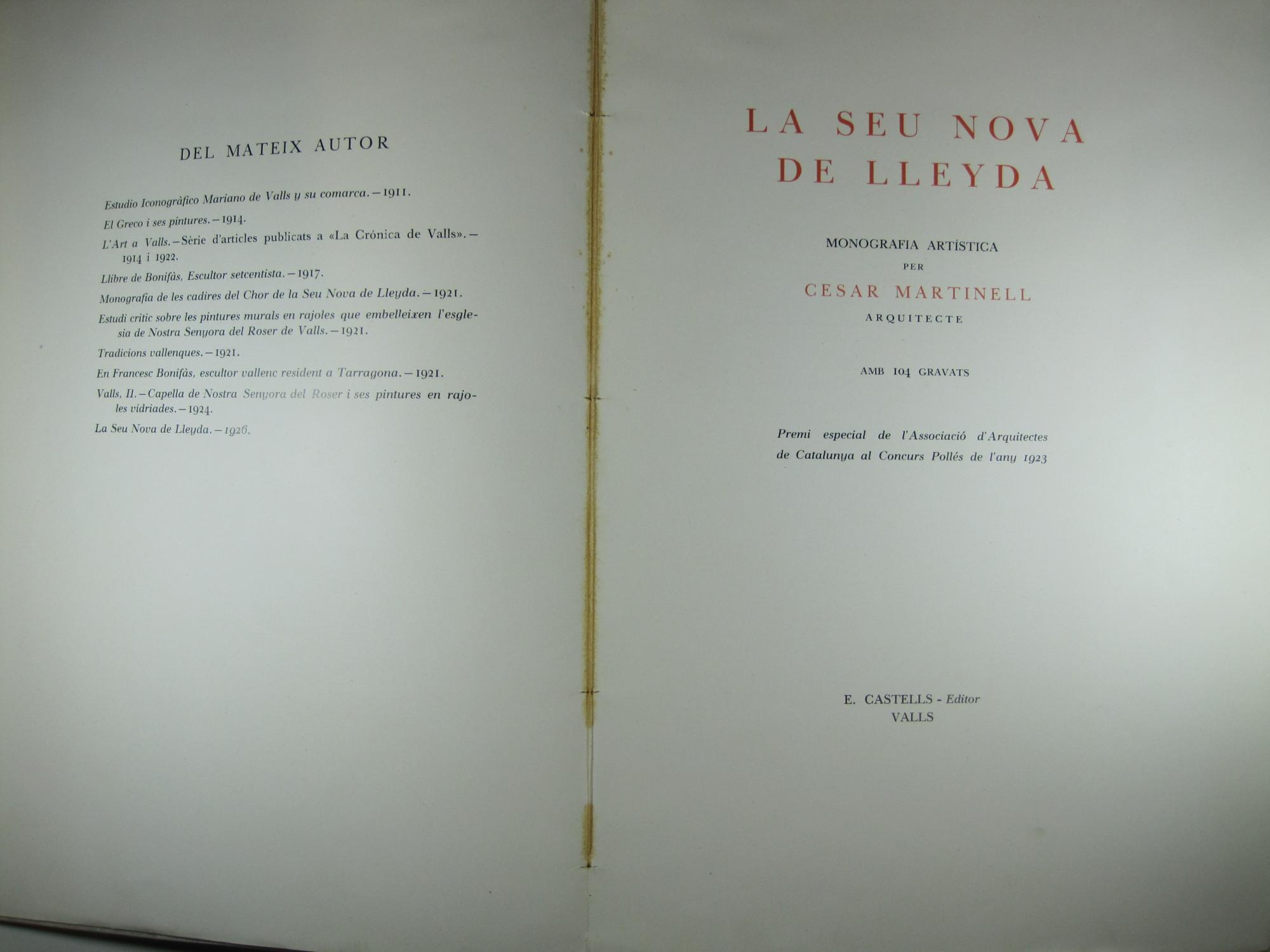 Add to basket1930 Lux - E. Castells, Barcelona 2a ed. Premi especial de l'Associació d'Arquitectes de Catalunya al Concurs Pollés de l'any 1923. Fot. i plànols en b/n. 269 p. 28x20 cm. Enc. en rústica edit. Petites taques. Para ver o recibir fotografías de los libros puede ir a nuestra web o solicitarlas.(Lleida, Lleida).