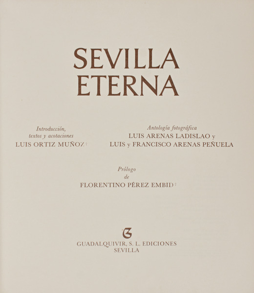 Add to basketIntroducción textos y acotaciones. Antología fotográfica, Luis Arenas Ladislao y Luis y Francisco Arenas Peñuela. Prólogo de Florentino Pérez Embid. Guadalquivir, S. L. Ediciones. Sevilla. 1986. De 30,5x27,5 cm. Com 478, [vii] págs. Encadernação do editor em tela com ferros a ouro na pasta anterior e na lombada, com sobrecapa de proteção. Profusamente ilustrado com fotografias. Obra impressa sobre papel couché das págs 37 a 396. Exemplar com dedicatória na folha de anterrosto. Obra bilingue em espanhol e inglês. Language: Bilingue / Bilingual Location/localizacao: I-23-E-41.